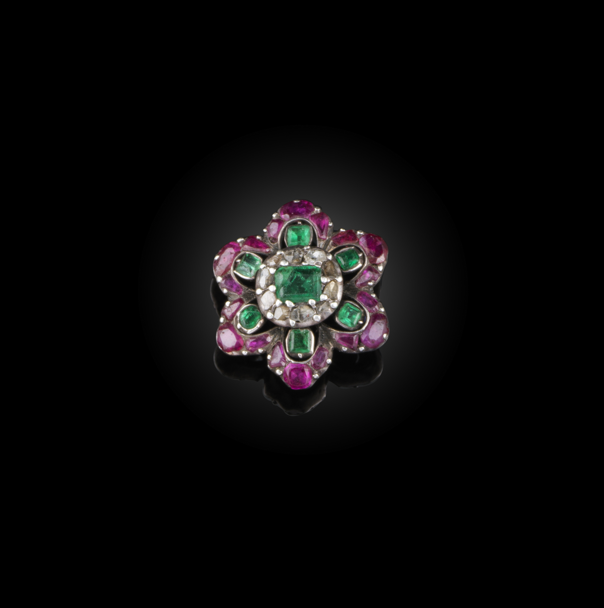 A George III gem-set flower brooch, the central emerald and diamond cluster within further emerald petals with ruby borders in closed back silver setting, later brooch fitting, width 2.5cm