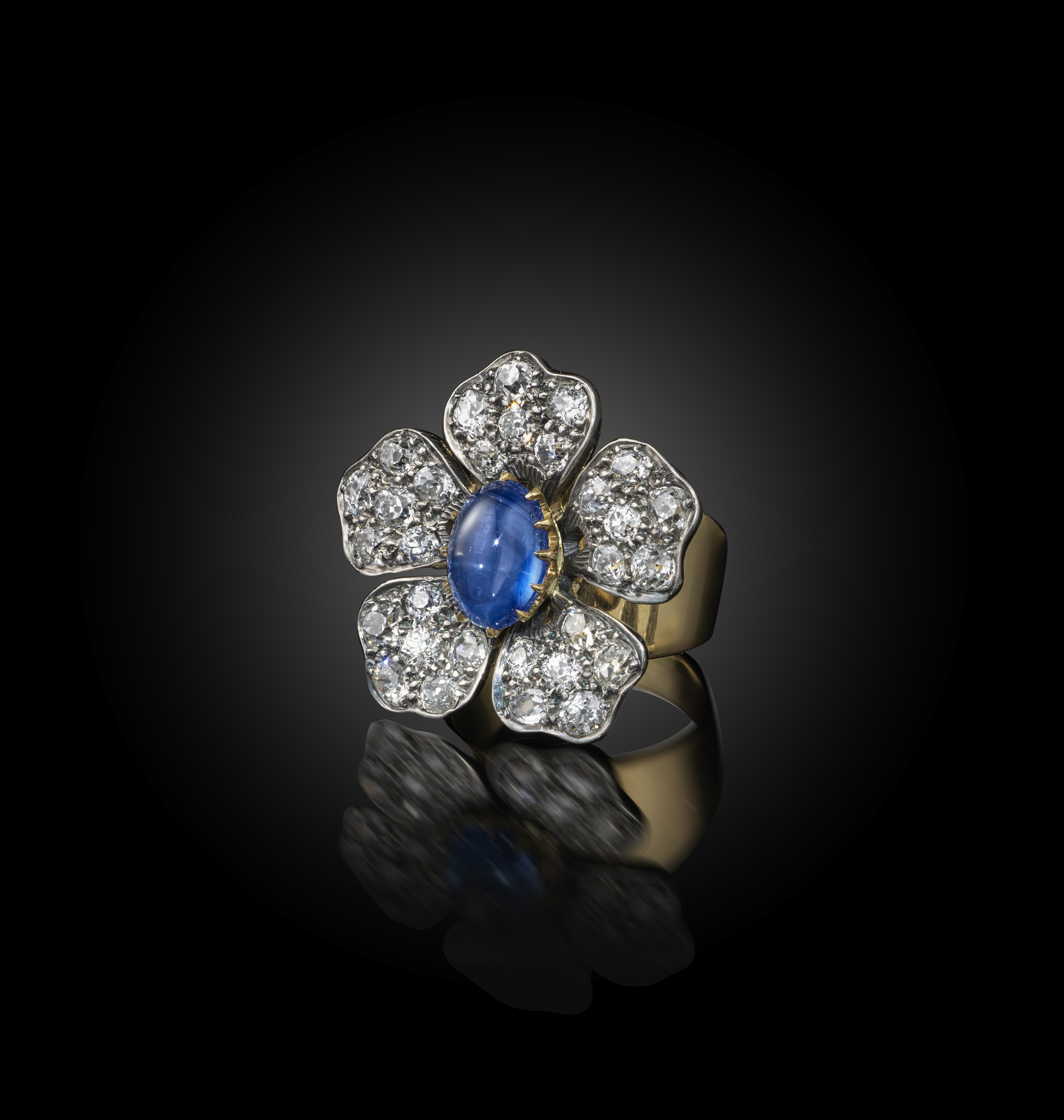 A sapphire and diamond flower ring, set with a central cabochon sapphire within diamond-set petals in silver and gold, size N