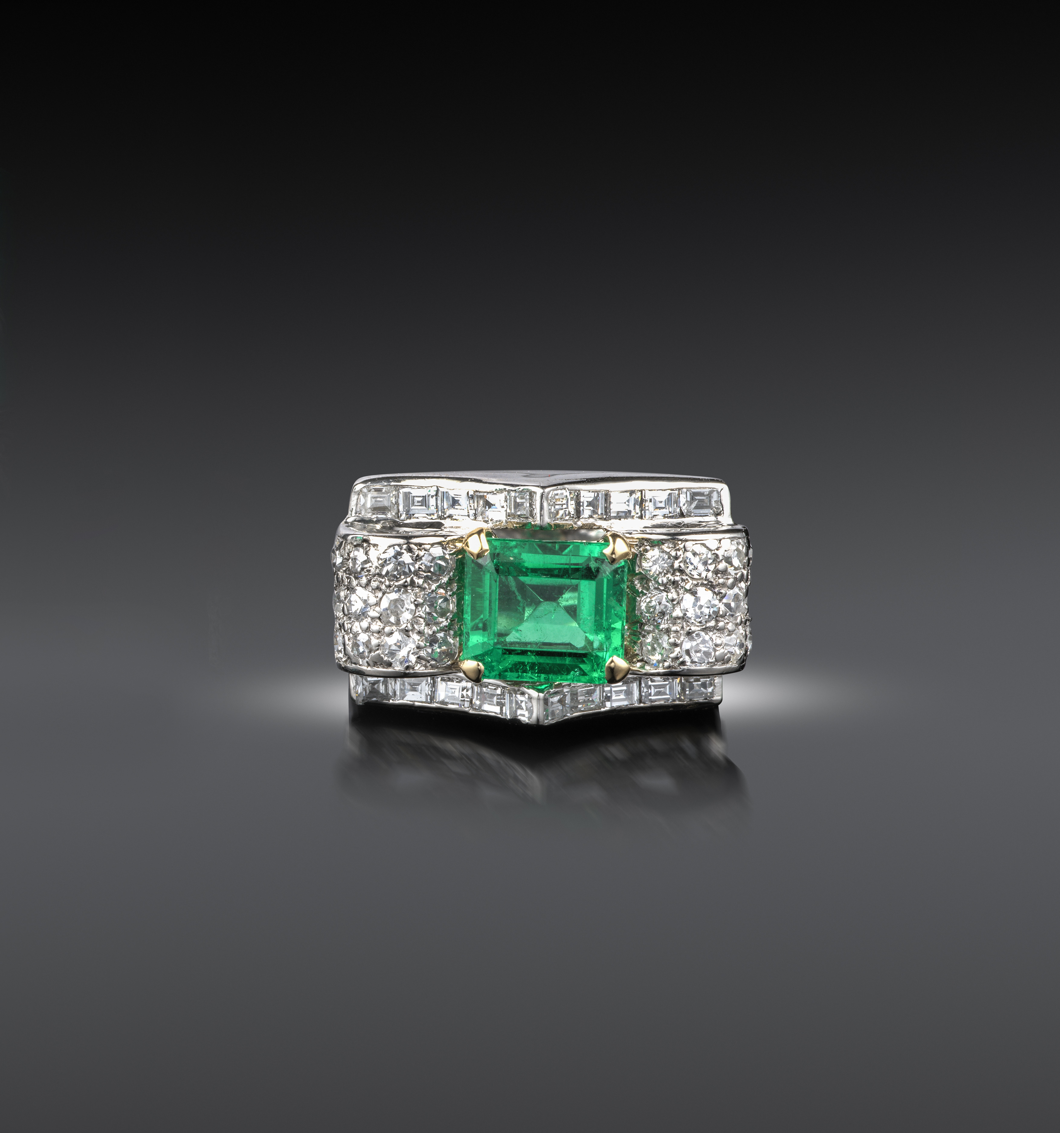 An emerald and diamond-set Odeonesque ring, C1935, the emerald-cut emerald weighs 2.07cts with pave-set round circular-cut diamond raised scroll shoulders and baguette-shaped diamond raised borders in platinum, indistinct letters and numbers stamped to upper inside shank, size H 1/2