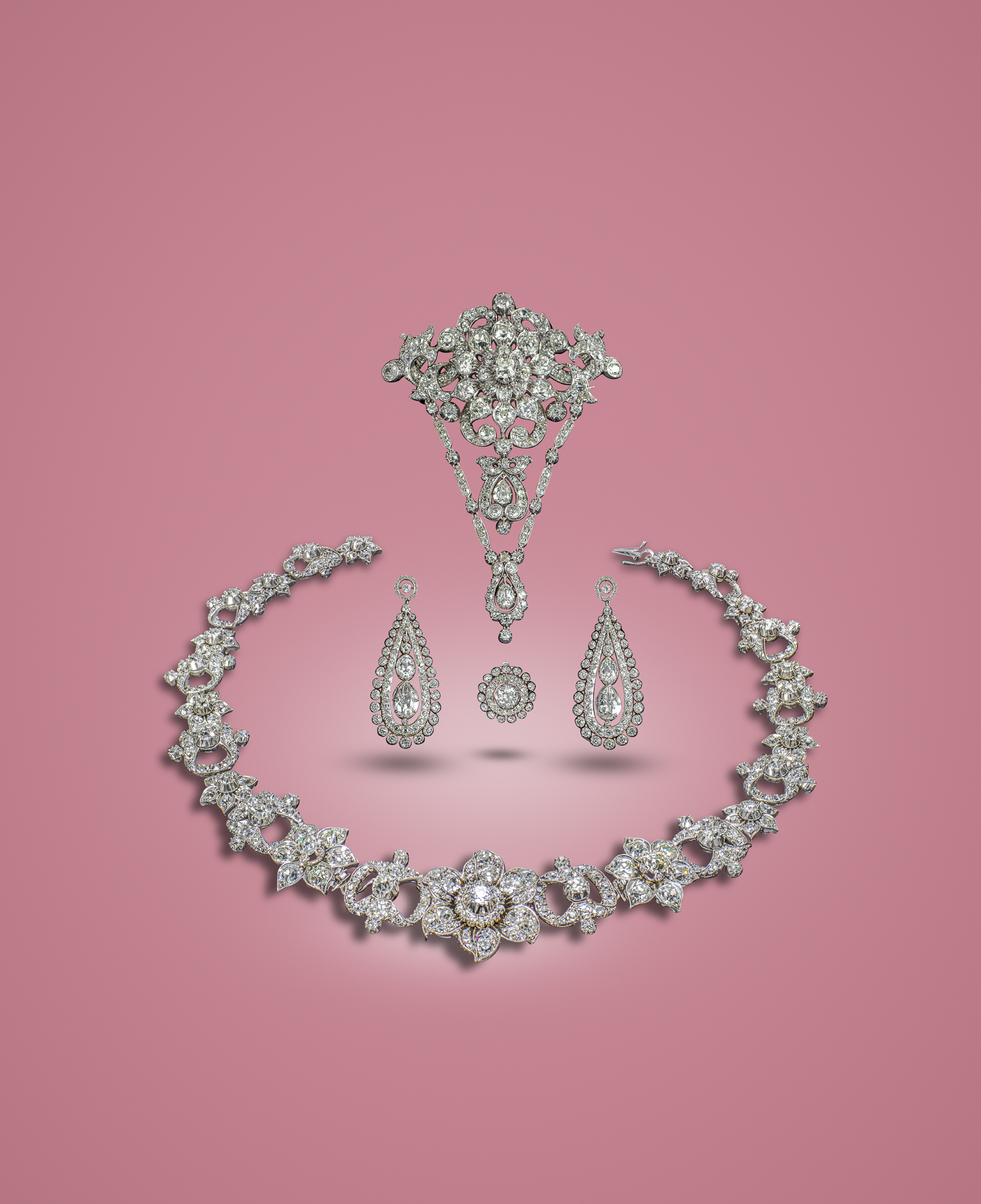 An important diamond parure, mid 19th century, comprising: a devant de corsage brooch, centring on a ten-petalled flower within undulating foliate scrollwork, suspending a detachable pendant and a festoon, set with rose-cut, cushion- and pear-shaped diamonds, measuring 8 x 11.7cm including festoon pendant, detachable brooch fittings; a necklace, composed of graduating floral motifs alternating with stylised ribbon bow links, set throughout with cushion-shaped diamonds, length 40.5cm, detaching into two bracelets, central section originally intended to be replaced with the devant de corsage and worn in combination as a single necklace; an impressive pair of earrings of elongated drop-shaped design, set with cushion-shaped diamond borders, centring on a line of cushion-shaped and antique pear-shaped diamonds, length 5.9cm, later tops circa 1910, hook fittings; and a small clip of radiating design set with cushion-shaped diamonds, 1.8cm diameter, each set in silver and gold, later rhodium plated, some later alterations to fittings, estimated total diamond weight approximately 65.00-70.00 carats, fitted case
