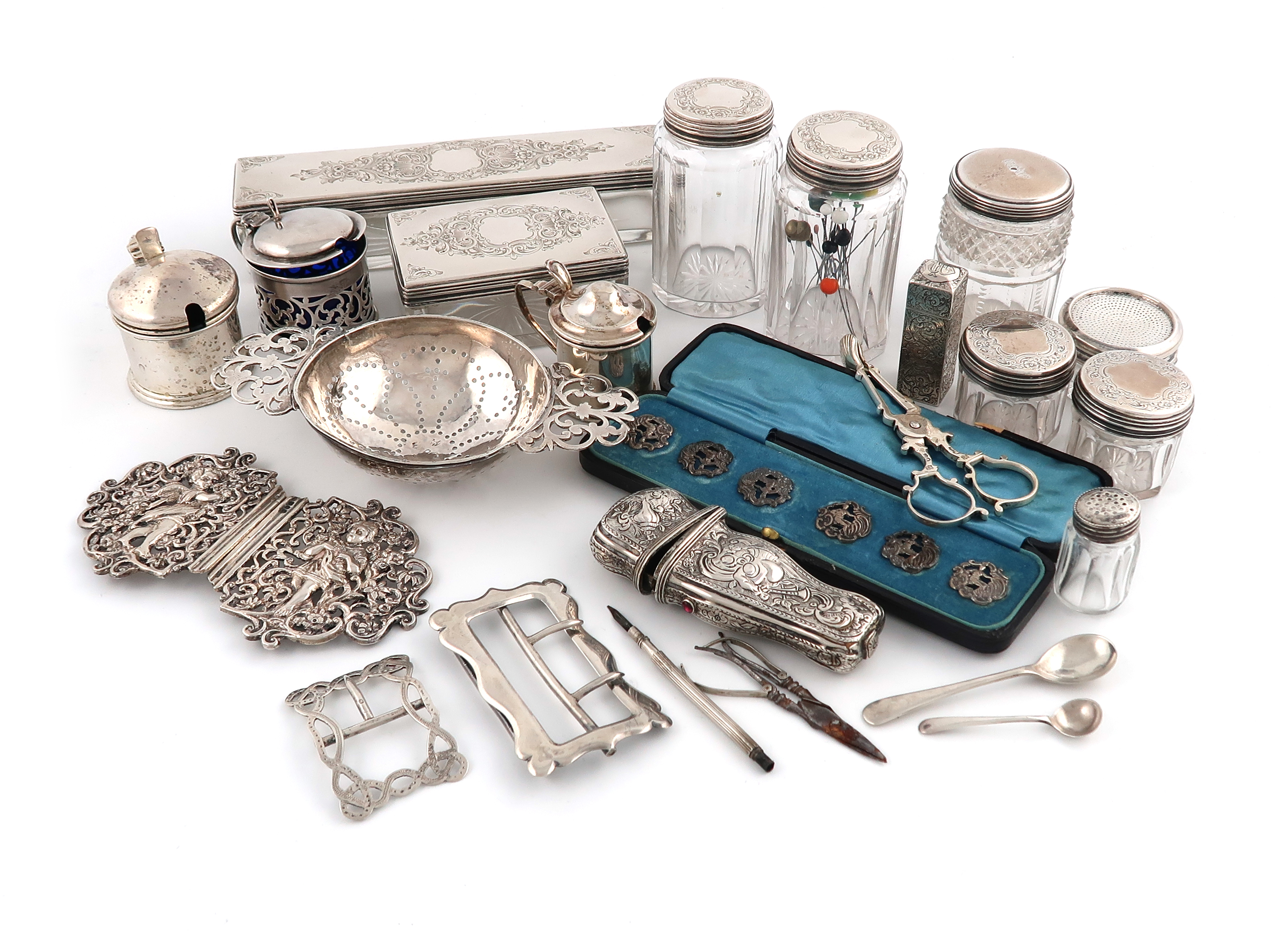 comprising: a late-Victorian nurse's belt buckle by George Unite & Sons, Birmingham 1891, a George I two-handled lemon strainer, probably London 1717, an etui case, the interior with two implements, a scent bottle, six mounted glass bottles, a mounted glass powder pot, three mustard pots, a mustard and salt spoon, a pair of sugar nips, two buckles, a cased set of six buttons and two covered glass toilet boxes, approx. weighable 15.6oz. (qty)