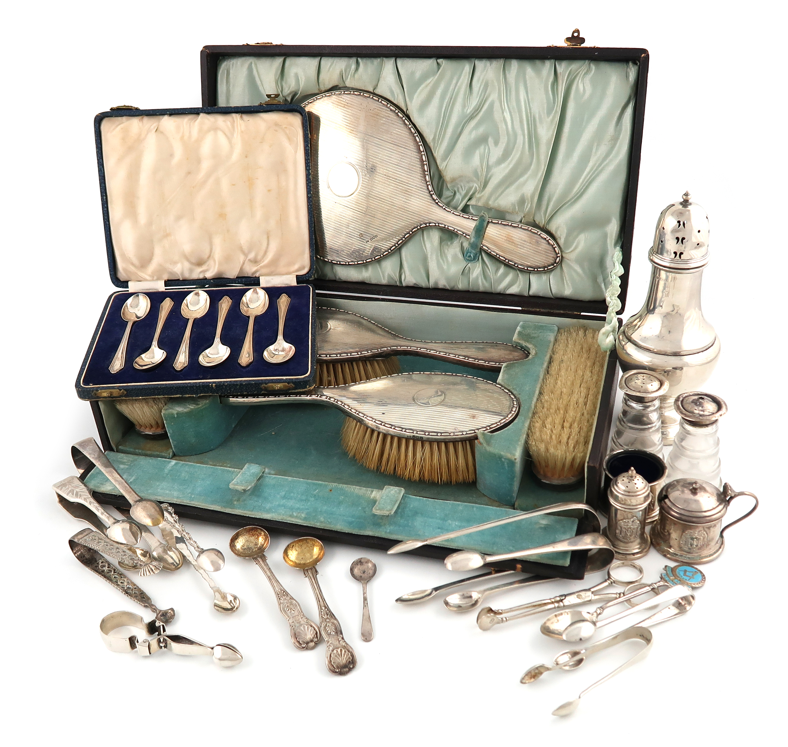 comprising: a sugar caster and three-piece condiment set applied with the arms of the Worshipful Company of Founders, Birmingham 1937/38, plus eight pairs of sugar tongs, a pair of 18th-century sugar nips, a pair of salt spoons, a cased five-piece dressing table set, a cased set of spoons, a pair of silver and glass churn salt and pepper pots, (a.f), a spoon and a pair of electroplated sugar tongs, approx. weighable 20oz. (qty)