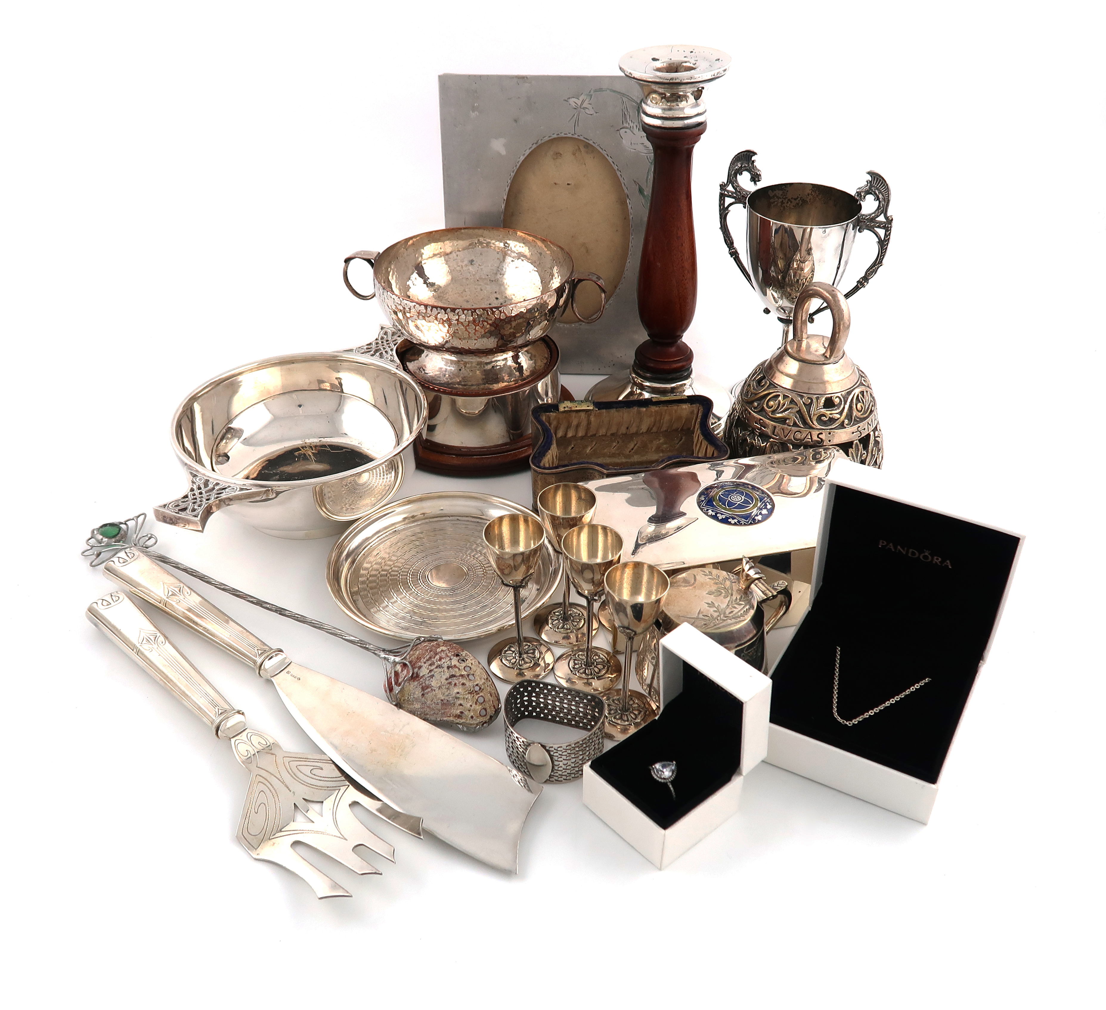 comprising: an Edwardian dressing table box base, by Nathan and Hayes, Chester, 1908, the front set with a ceramic heart motif, a silver and wooden candlestick, an electroplated Arts and Crafts box, the cover with an enamelled boss, four liqueur goblets, two quaiches, a bell, and other items. (qty)