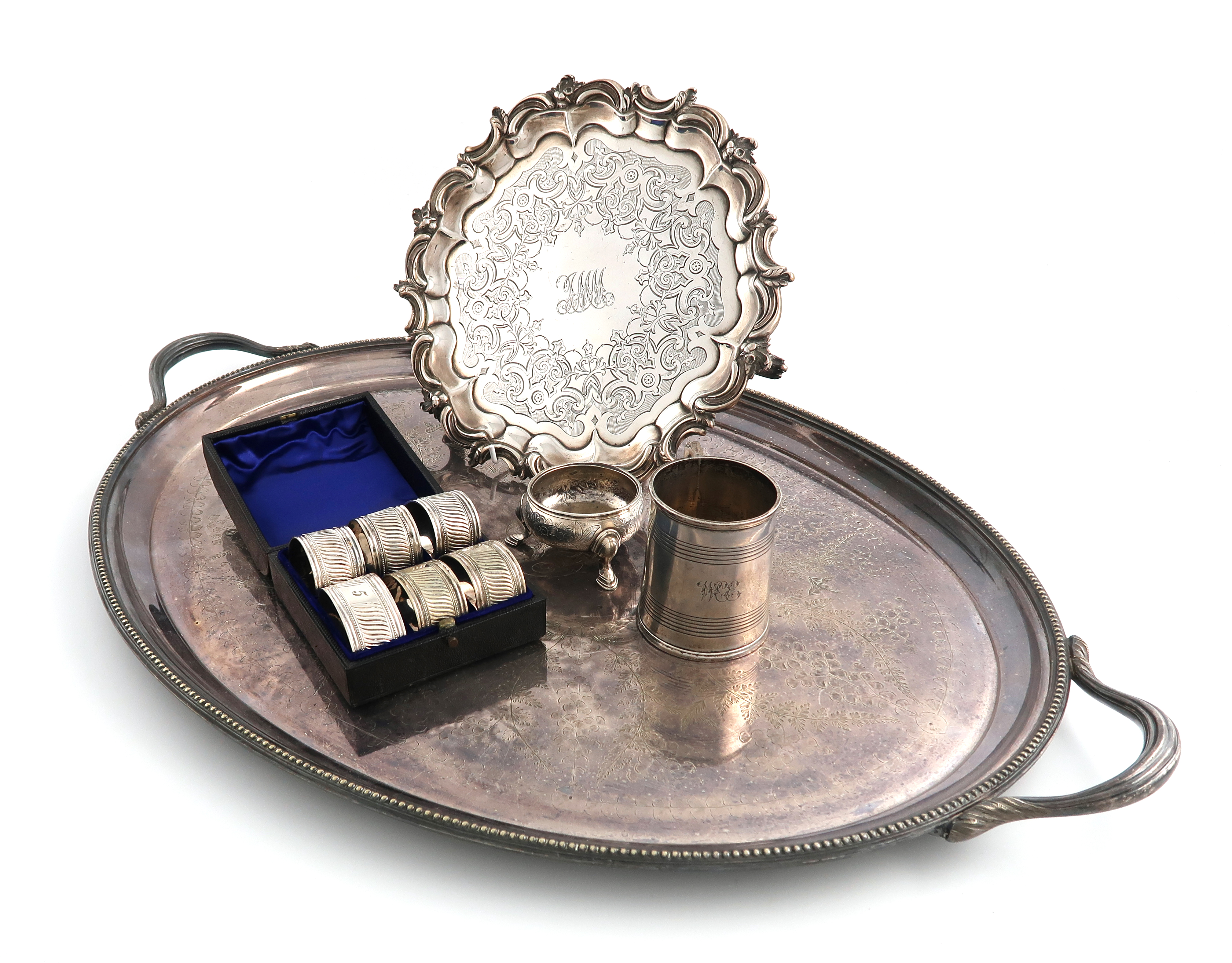comprising silver items: a Victorian salver, by J and A Savory, London 1849, circular form, foliate scroll border, the centre engraved and initialled, diameter 26cm, plus a Victorian mug, London 1875, and a George II salt cellar, plus electroplated items: an oval tray and a cased set of six napkin rings, approx. weighable 28oz. (5)