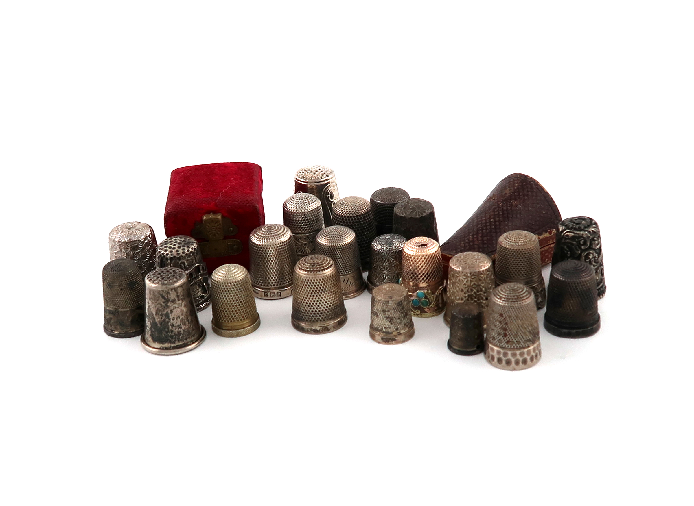 comprising: an unmarked gold one, set with turquoise, fifteen silver thimbles, plus six unmarked/electroplated ones, and two cases. (qty)