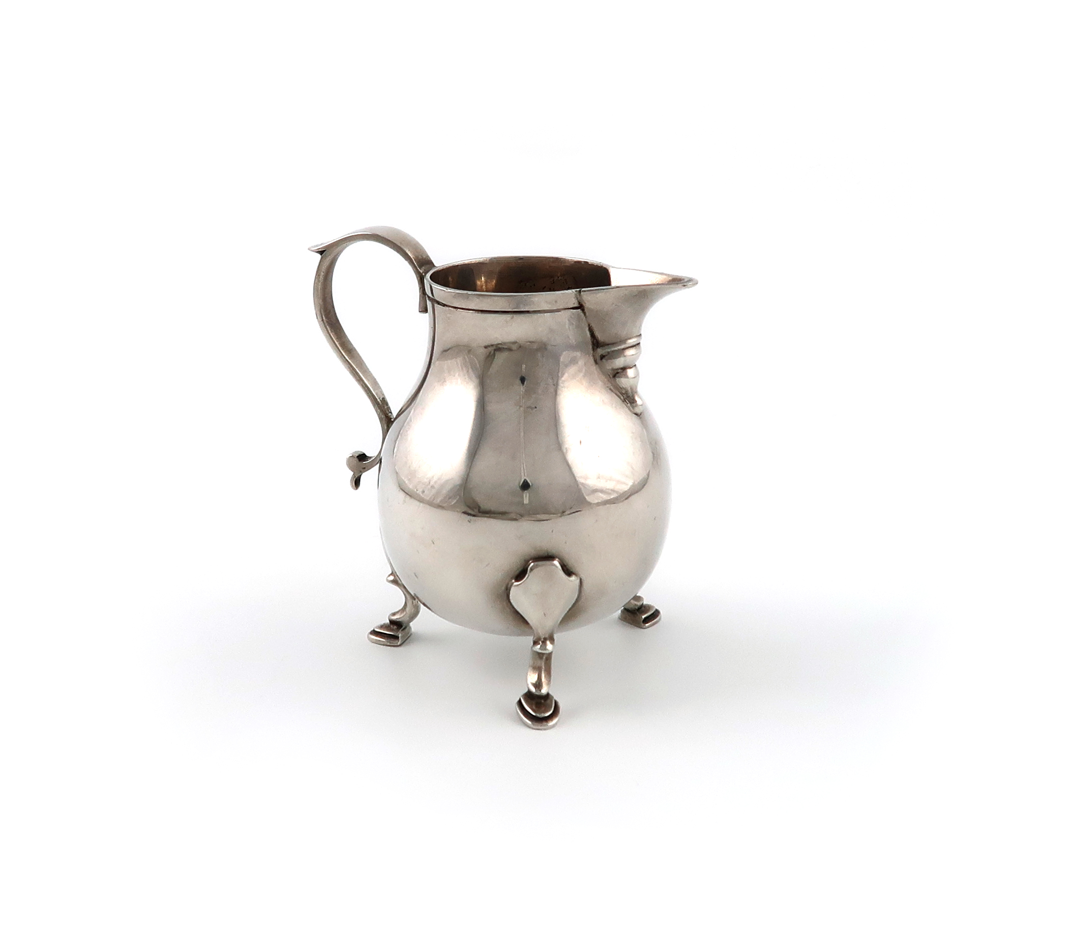 baluster form, scroll handle, on three hoof feet, height 9.2cm, approx. weight 6.5oz.
