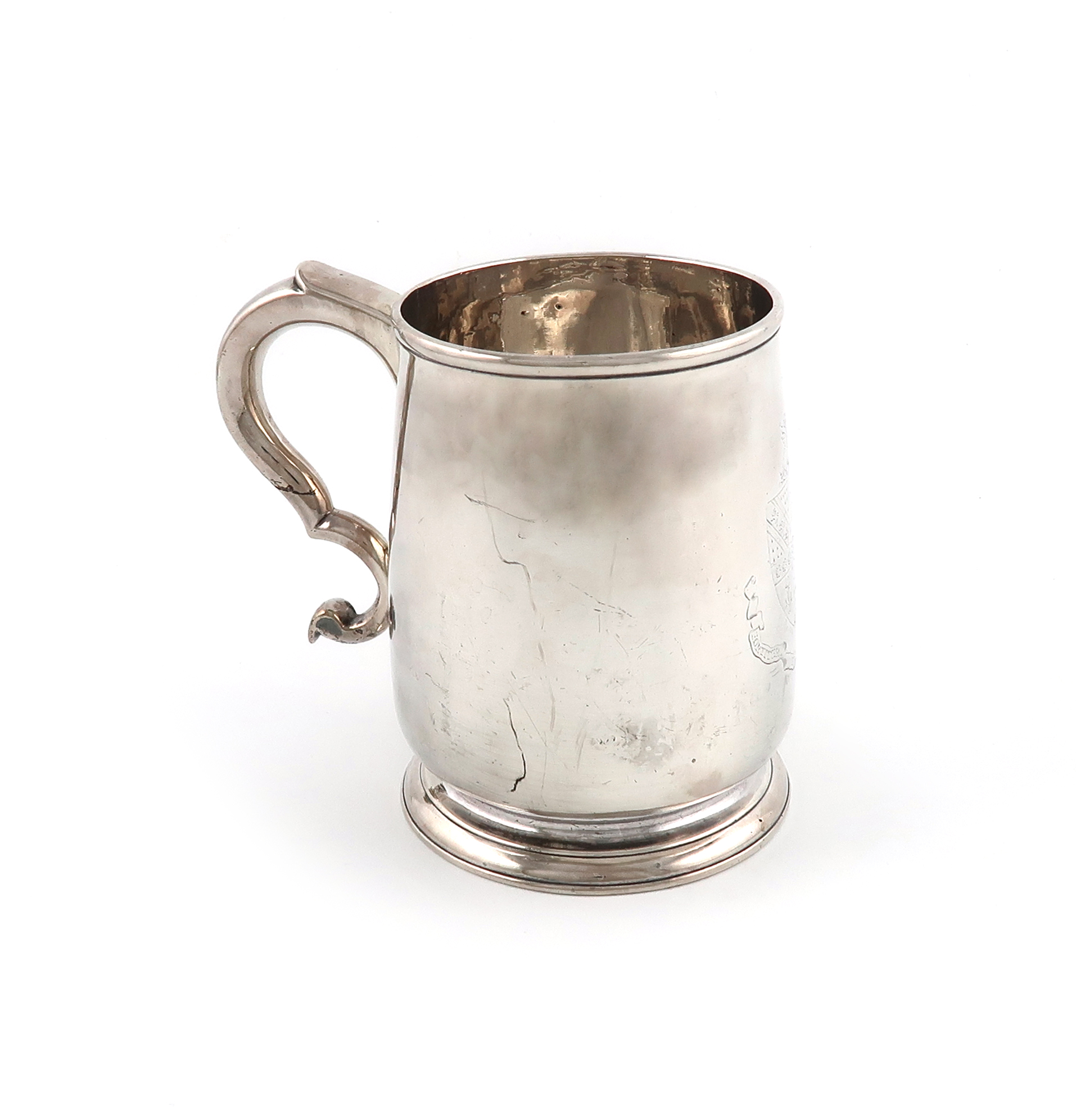 tapering form, scroll handle, the front with an armorial shield, on a raised circular foot, the underside later inscribed, height 11.7cm, approx. weight 12.3oz.