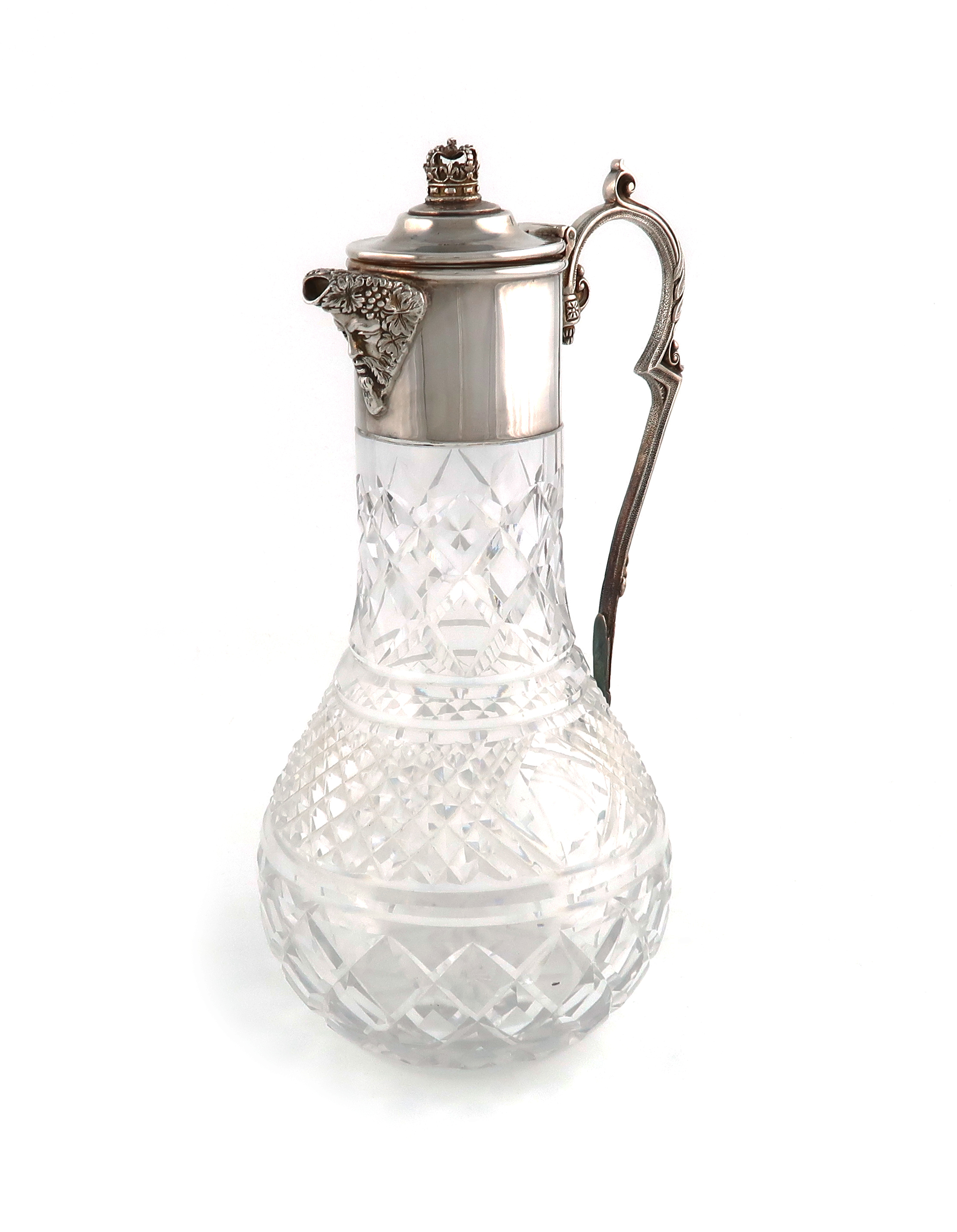 tapering bellied form, the mount with a scroll form foliate handle, Bacchus mask spout, domed hinged cover with crown finial, height 29.8cm.