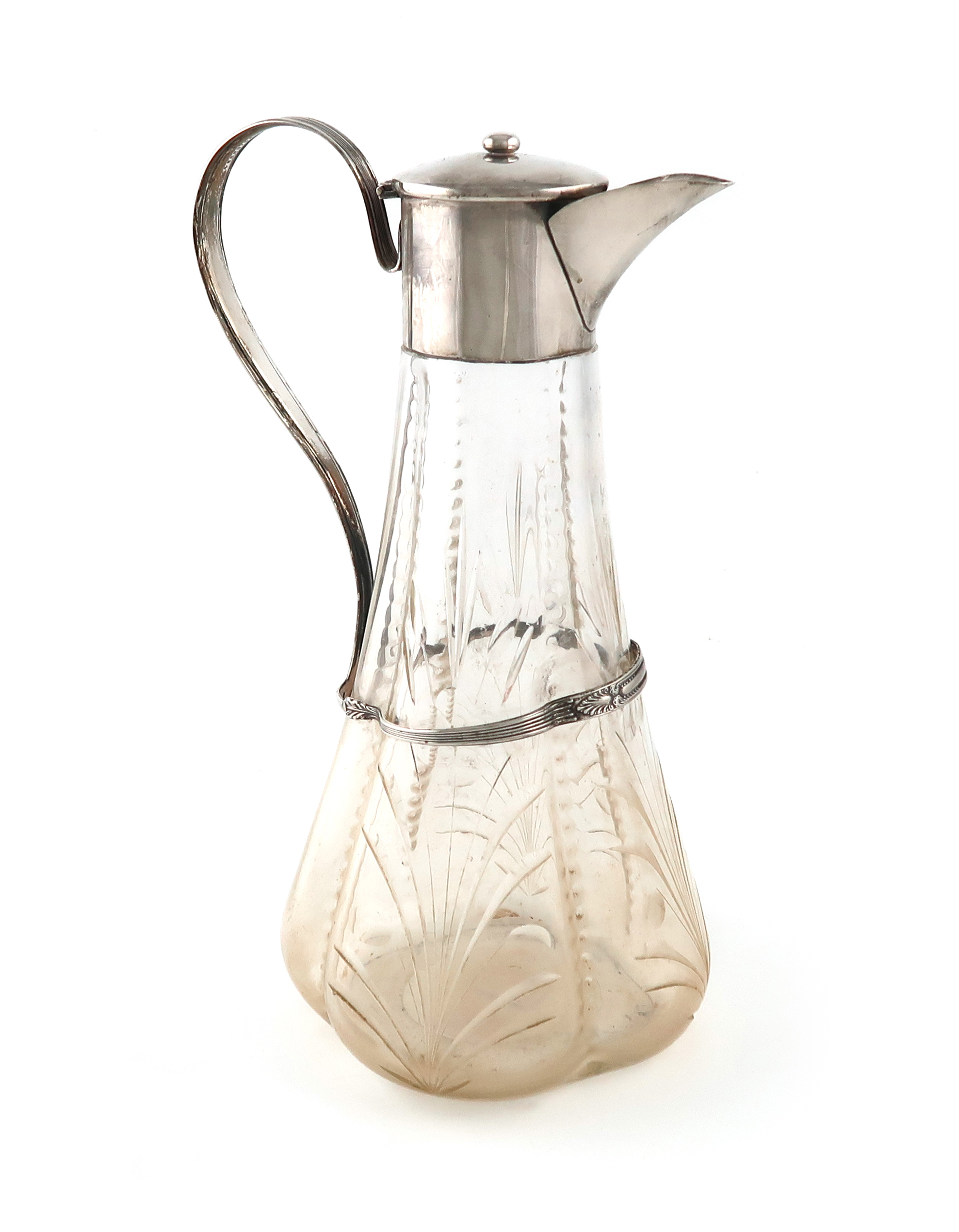 tapering lobed circular form, the glass with engraved decoration, plain mount with a hinged cover, fluted scroll handle, height 25cm.