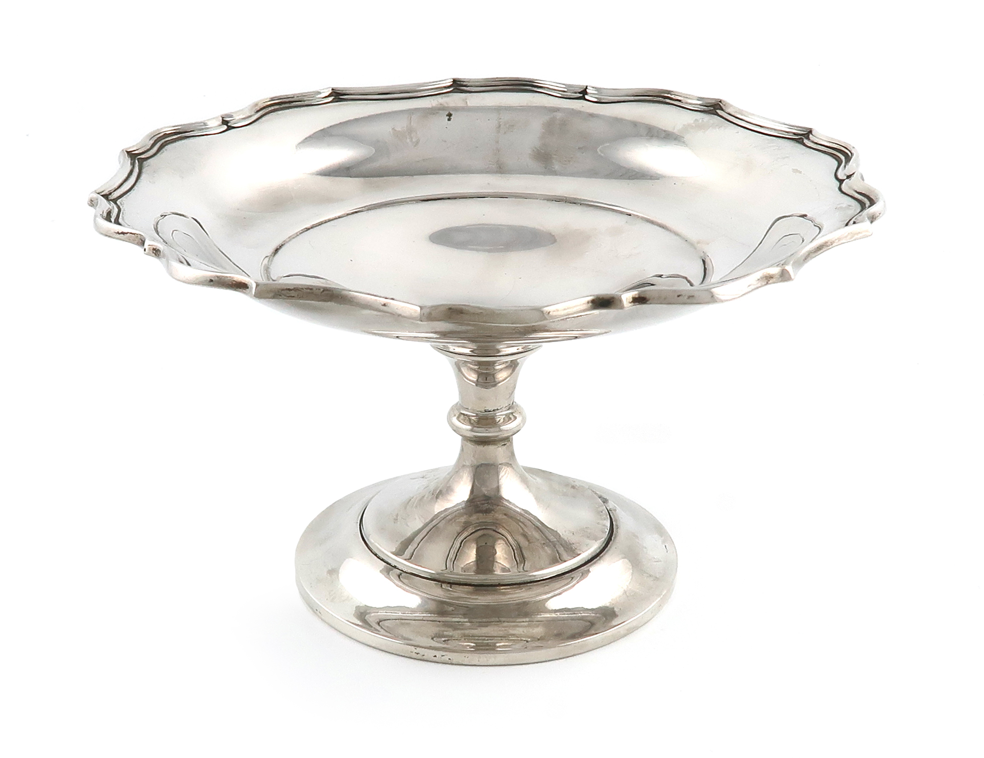 circular form, moulded border, on a raised circular foot, diameter 21cm, approx. weight 11.9oz.