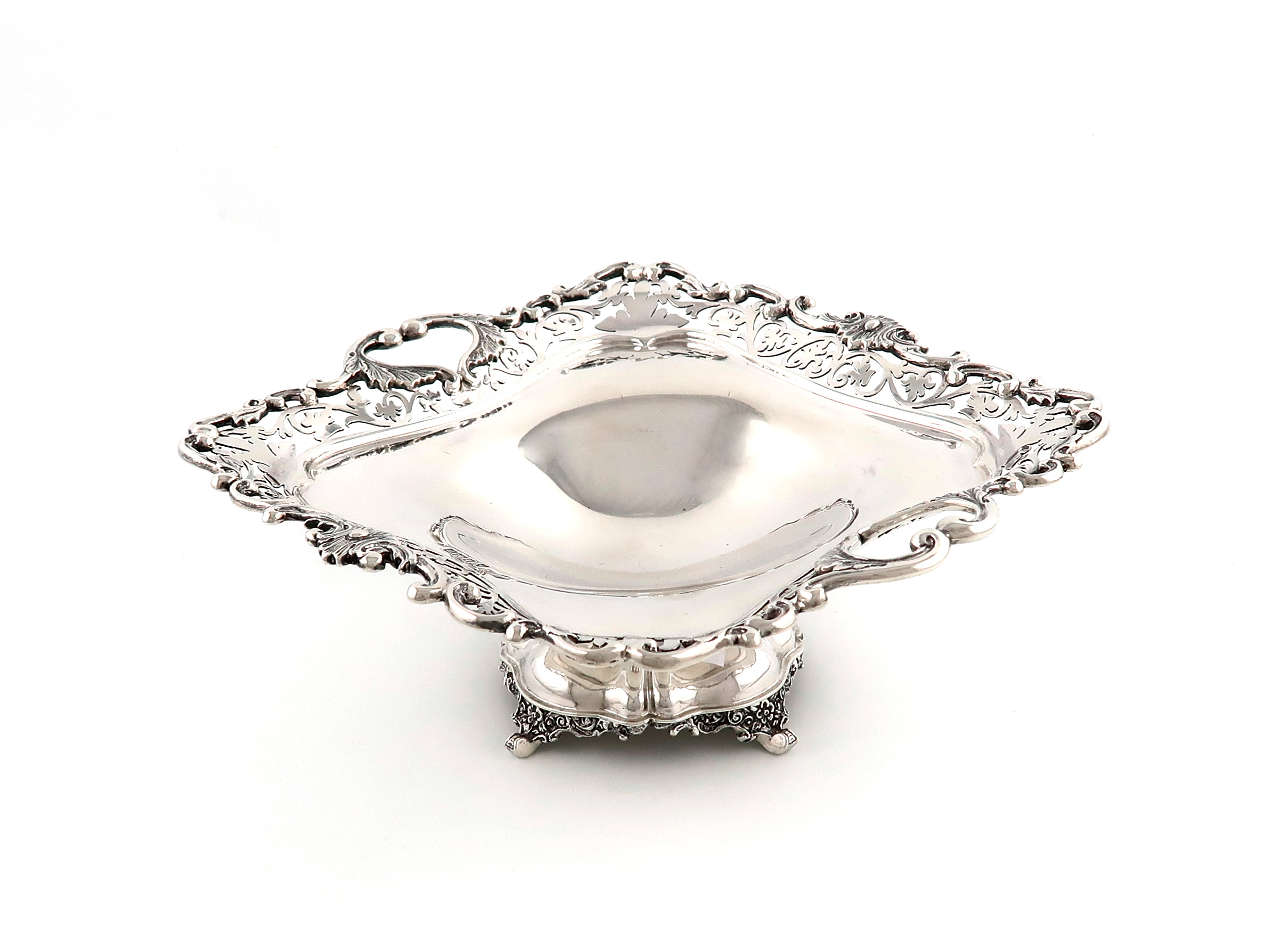 shaped square form, inset handles, pierced foliate border, on a raised shaped square foot on four bracket feet, length 22.4cm, approx. weight 16.7oz.