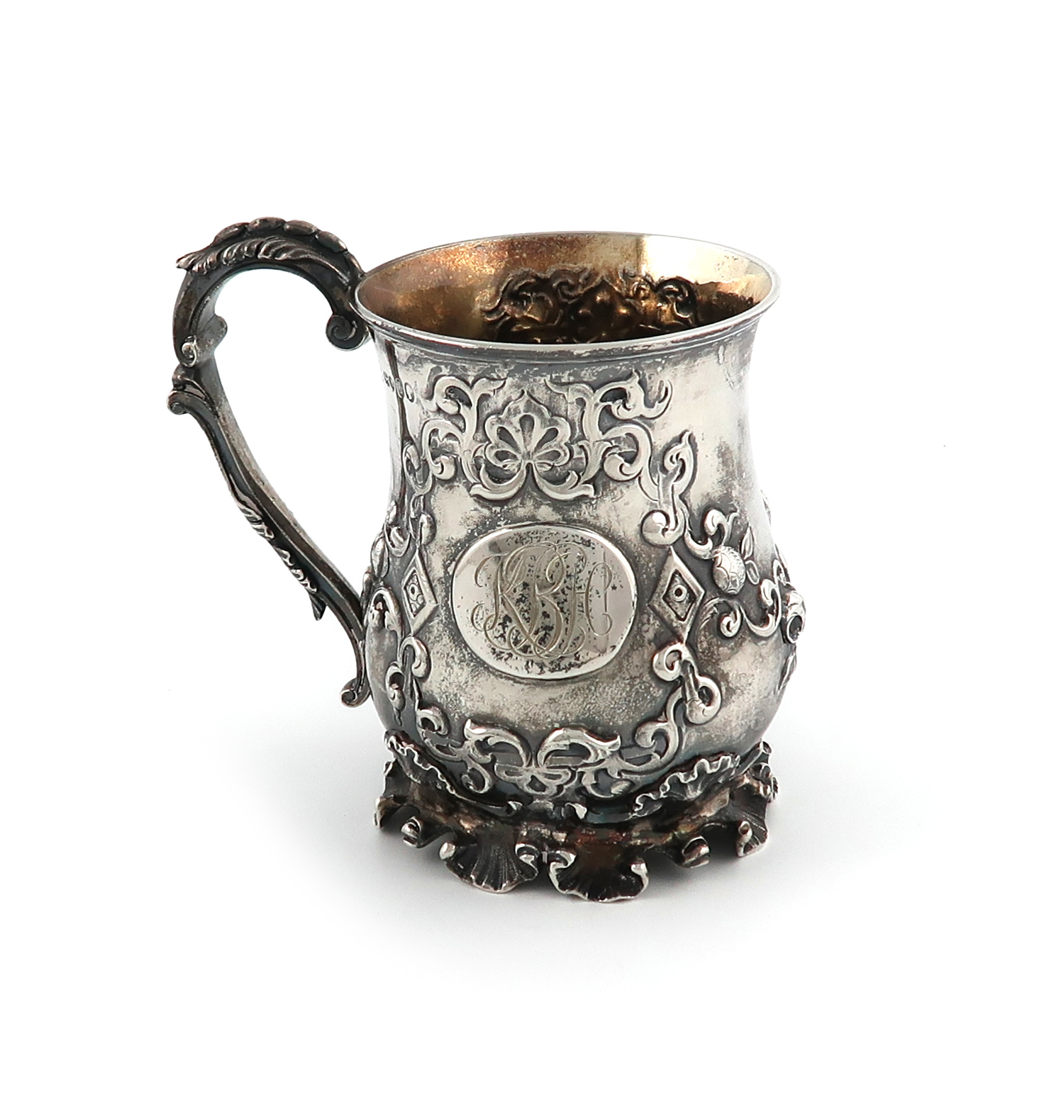 baluster form, embossed decoration, leaf-capped handle, applied with an initialled cartouche, height 11cm, approx. weight 7oz.