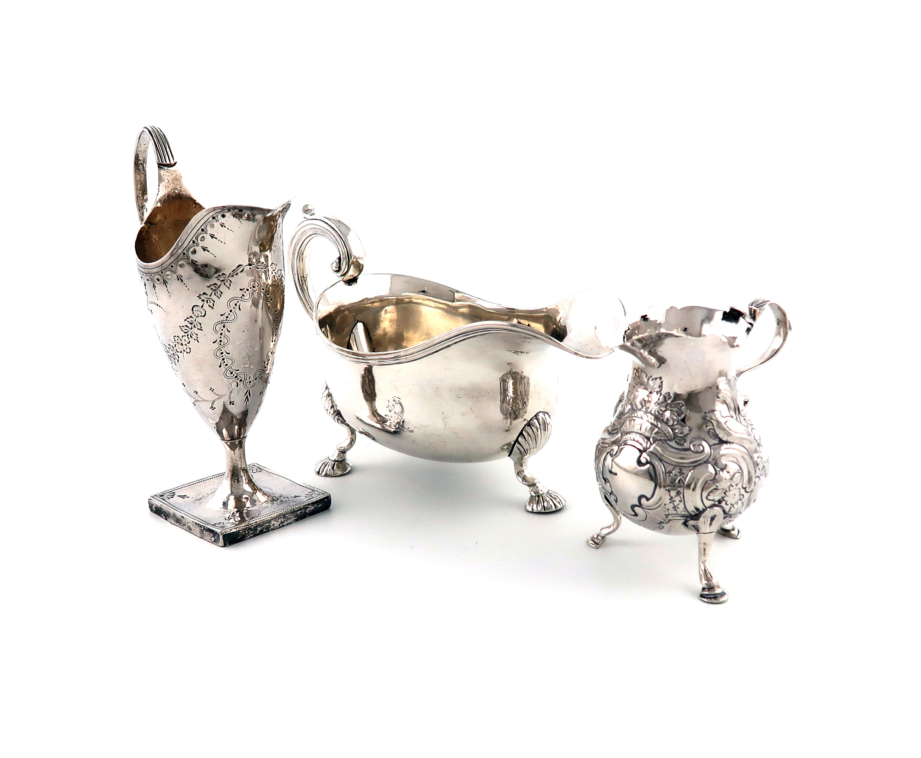 oval form, scroll handle, the base with a reservoir for hot water, and with a hinged cover, on four pad feet, engraved with a crest, length 18cm, plus a George III silver helmet cream jug, London 1788, and George II silver baluster cream jug, London 1758, approx. weight 14.7oz. (3)
