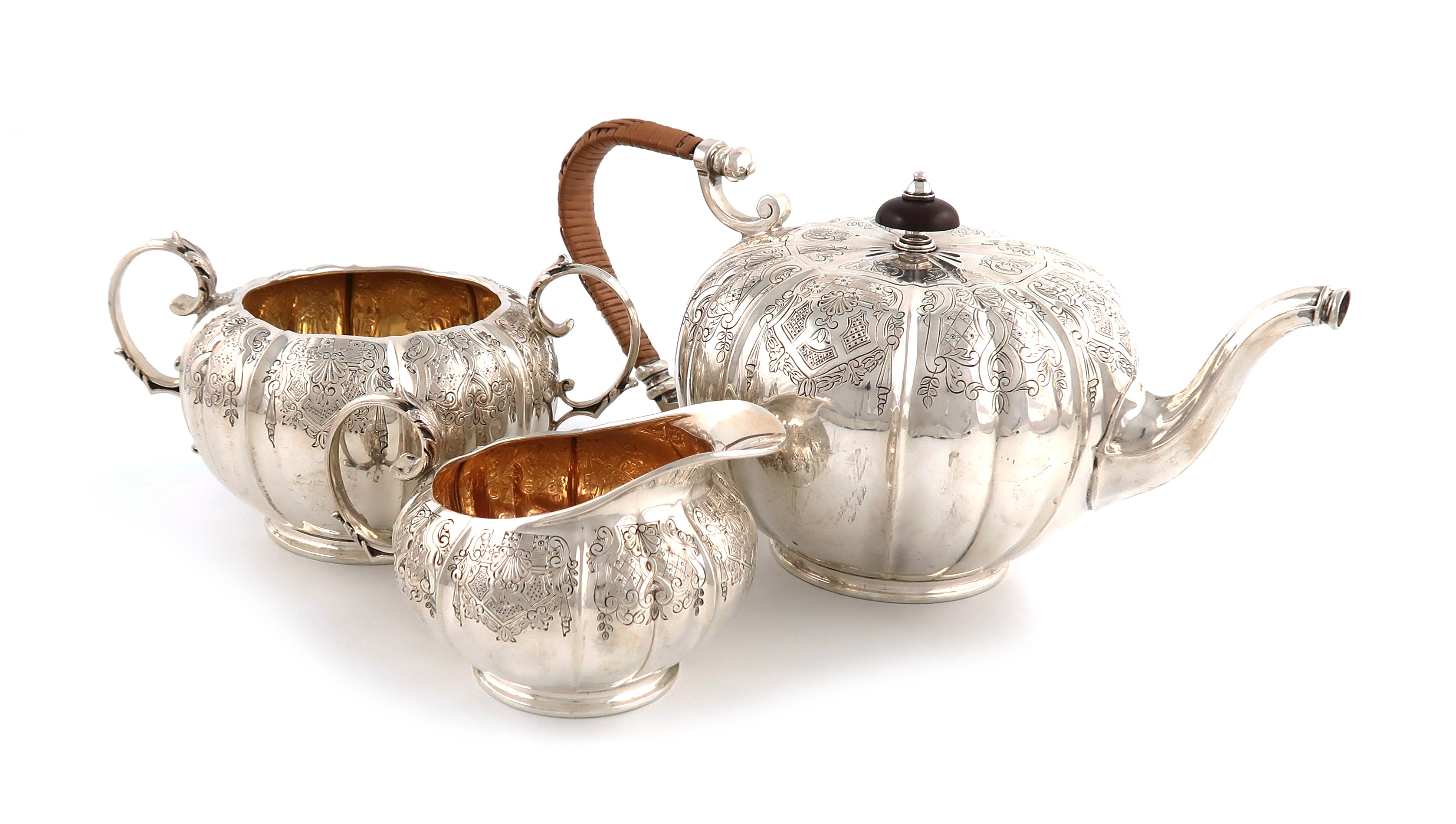 lobed circular form, engraved scroll, lattice and shell decoration, flush-hinged cover, wicker-bound scroll handle, the cream and sugar with gilded interiors, on circular bases, length handle to spout 27.5cm, approx. weight 39oz. (3)