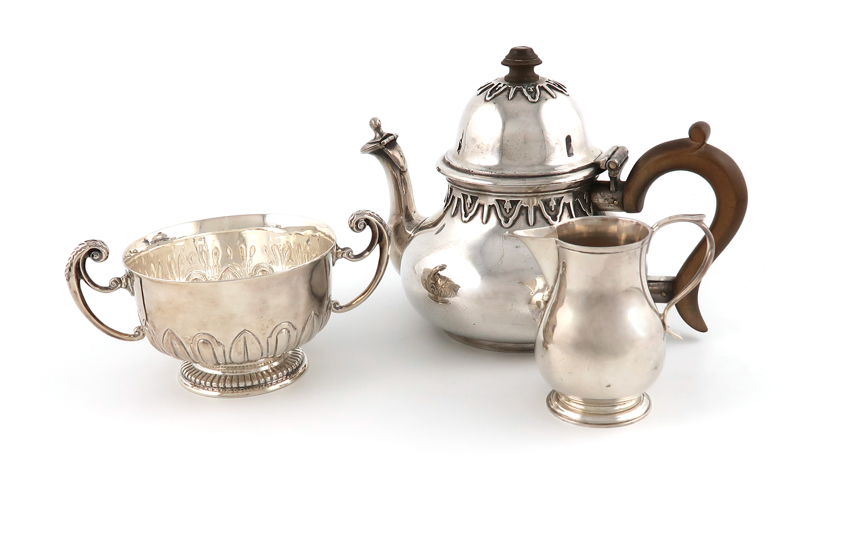 comprising: a teapot, by Charles & Richard Comyns, London 1926, a sugar bowl, by Wakely & Wheeler, London 1907, and a cream jug, by J B Chatterley & Sons Ltd, Birmingham 1957, total approx. weight 30.2oz. (3)