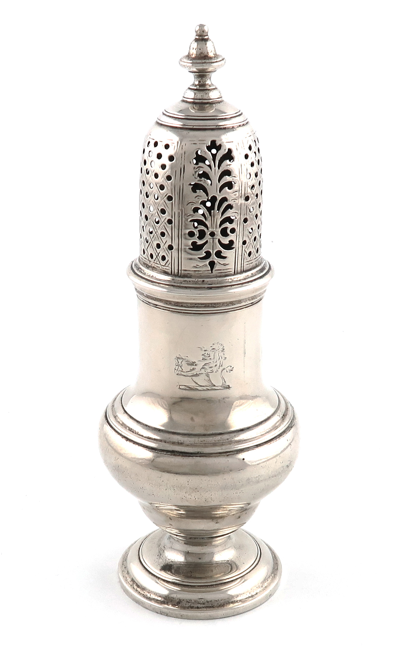 baluster form, pull-off pierced cover with a knop finial, engraved with a crest, on a raised circular foot, height 18.7cm, approx. weight 8.5 oz.
