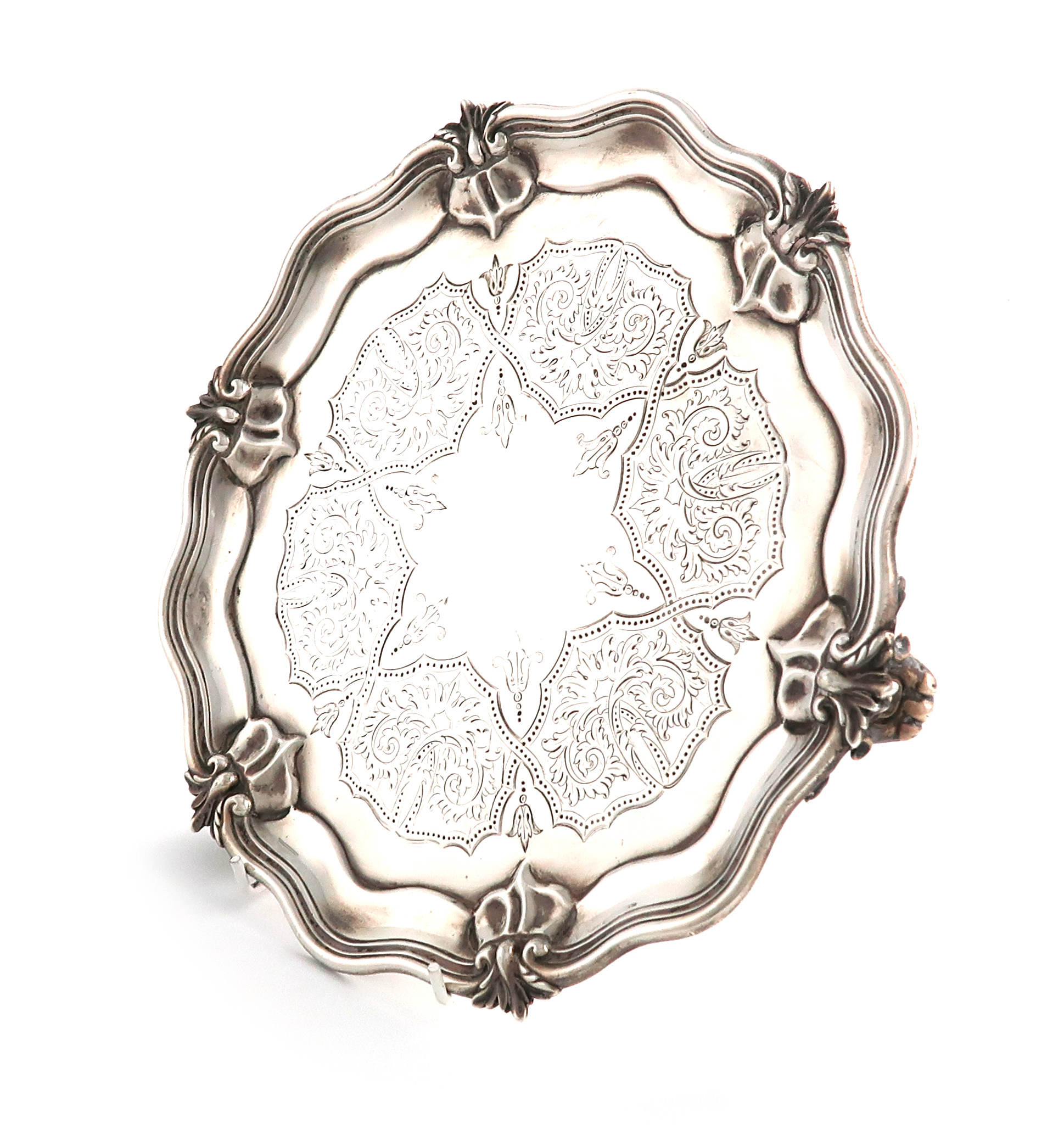 circular form, foliate and scroll moulded border, the centre with engraved foliate scroll decoration, on three foliate bracket feet, diameter 26.2cm, approx. weight 16.5oz.