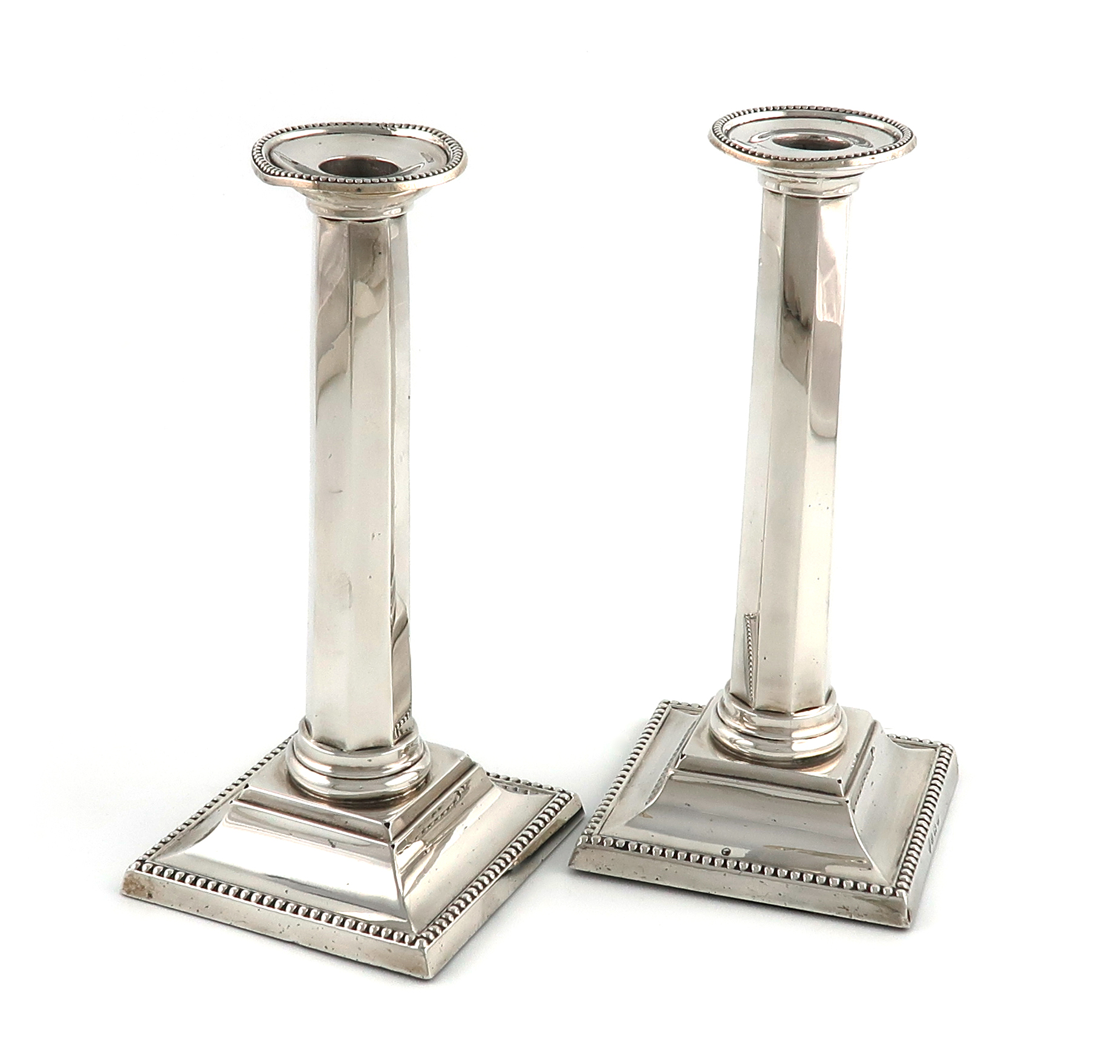 octagonal-shaped stems, beaded borders, with pull-off drip pans, on raised square bases, height 21cm. (2)