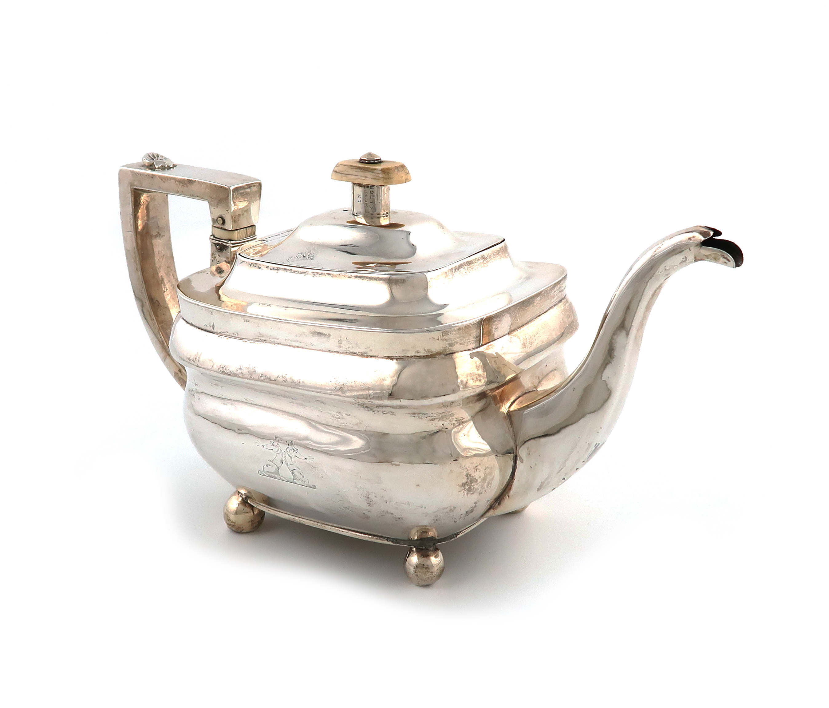 rounded rectangular form, shell-capped scroll handle with ivory insulators, the hinged cover with an ivory finial, on four ball feet, engraved with a crest, length handle to spout 27cm, approx. weight 20oz.