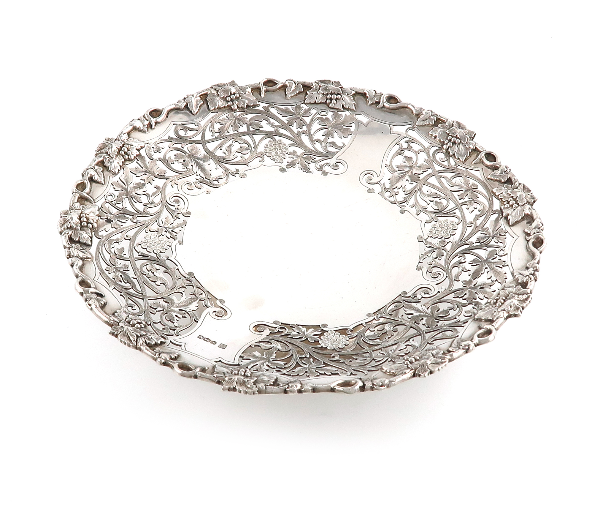 circular form, pierced with trailing grapevines, the border with further embossed grapevines, on a circular foot, diameter 26.5cm, approx. weight 25.6oz.