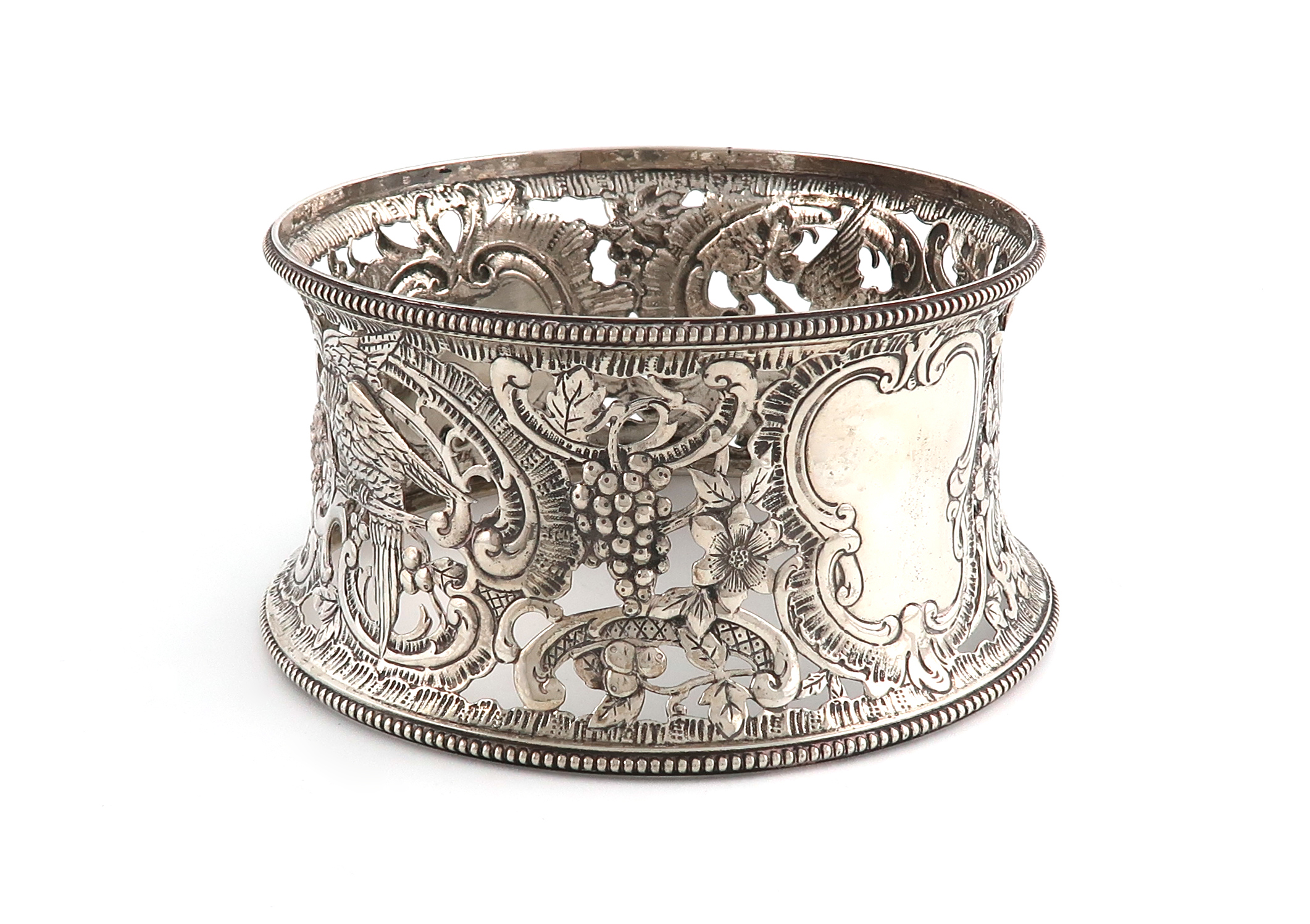 circular tapering form, beaded borders, pierced and embossed with birds, grapes and foliate scroll decoration, diameter 18.3cm, approx. weight 13oz.
