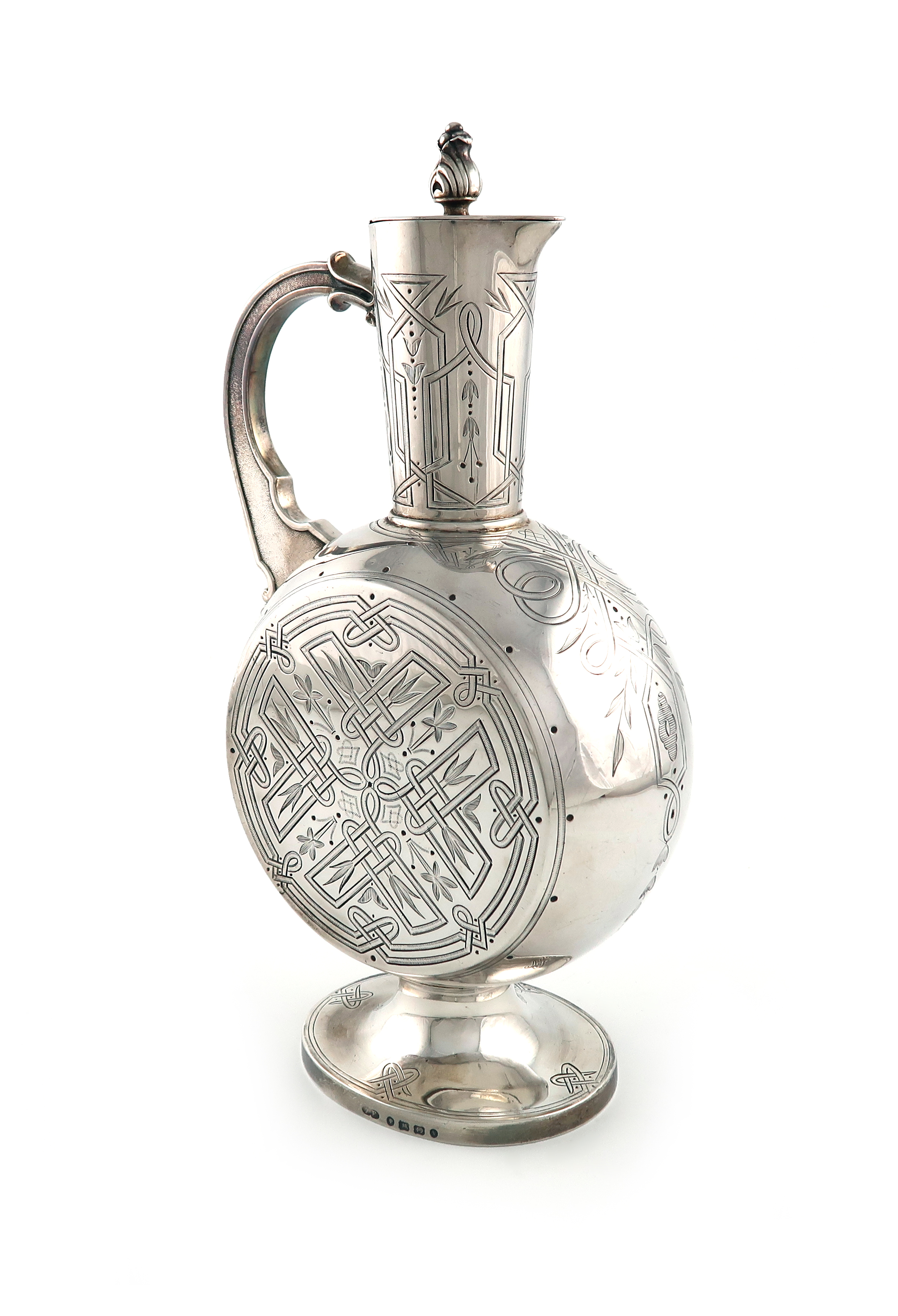 circular body, engraved decoration, scroll handle, tapering neck, flush-hinged cover, foliate finial, on a raised oval foot, height 27.5cm, approx. weight 18oz.