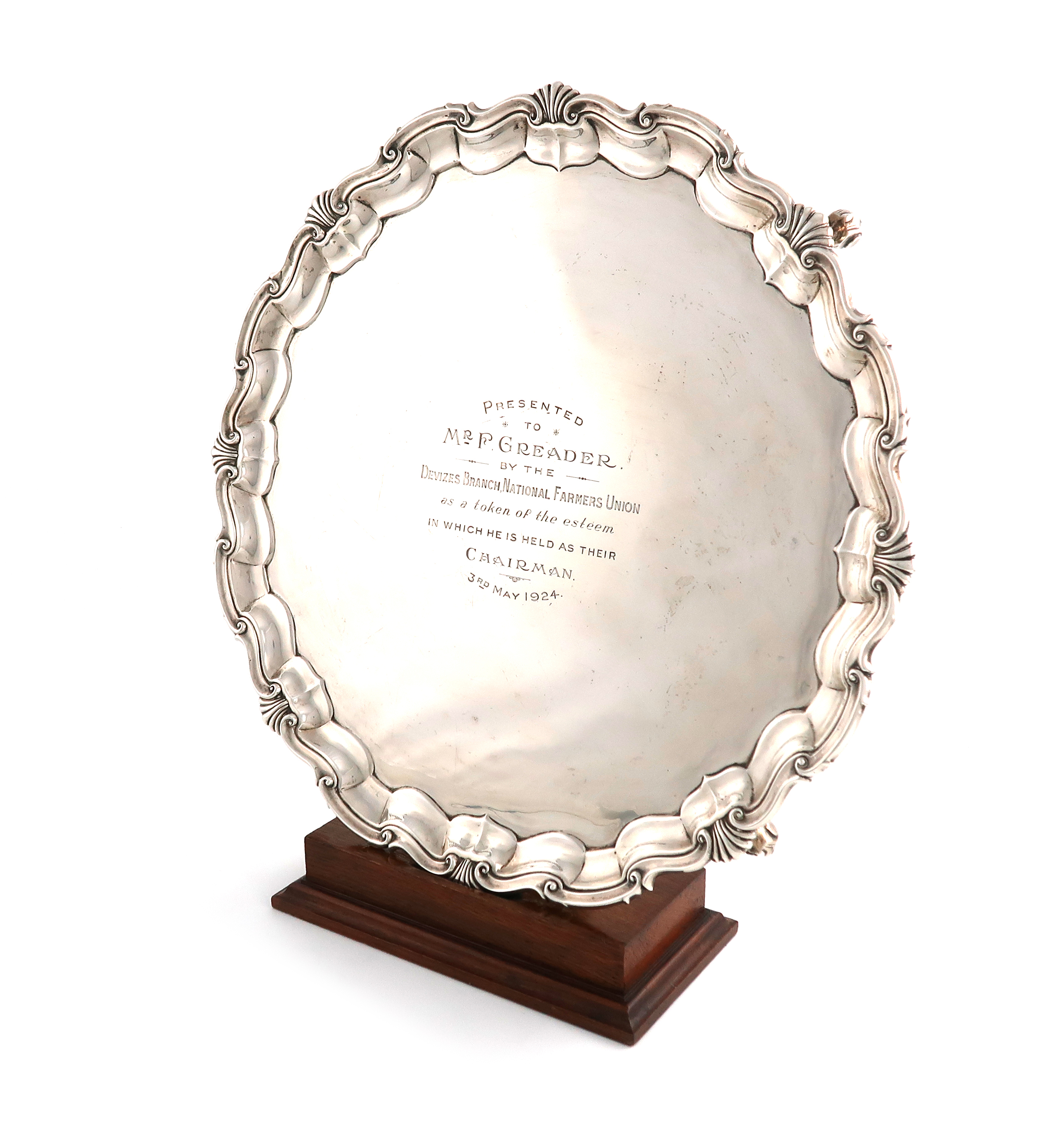 circular form, moulded border, on four gnarl feet, with a presentation inscription, and with a wooden stand, diameter 41.5cm, approx. weight 58.6oz. (2),