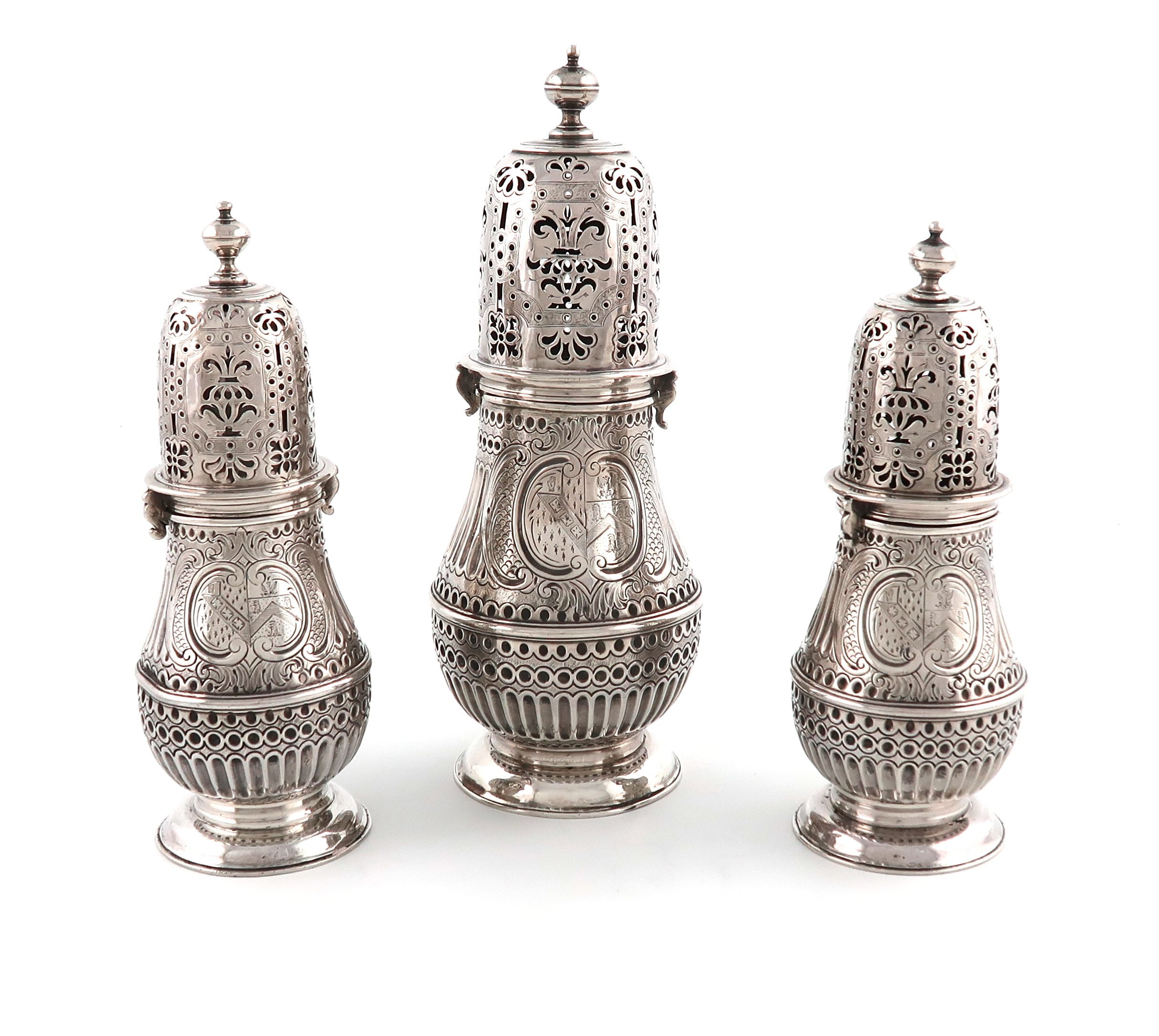 baluster form, central girdles, fluted decoration, pierced pull-off covers with knop finials, on a raised circular foot, engraved with an armorial, height of larger 21cm, height of smaller 16.5cm, approx. weight 21.5oz. (3)