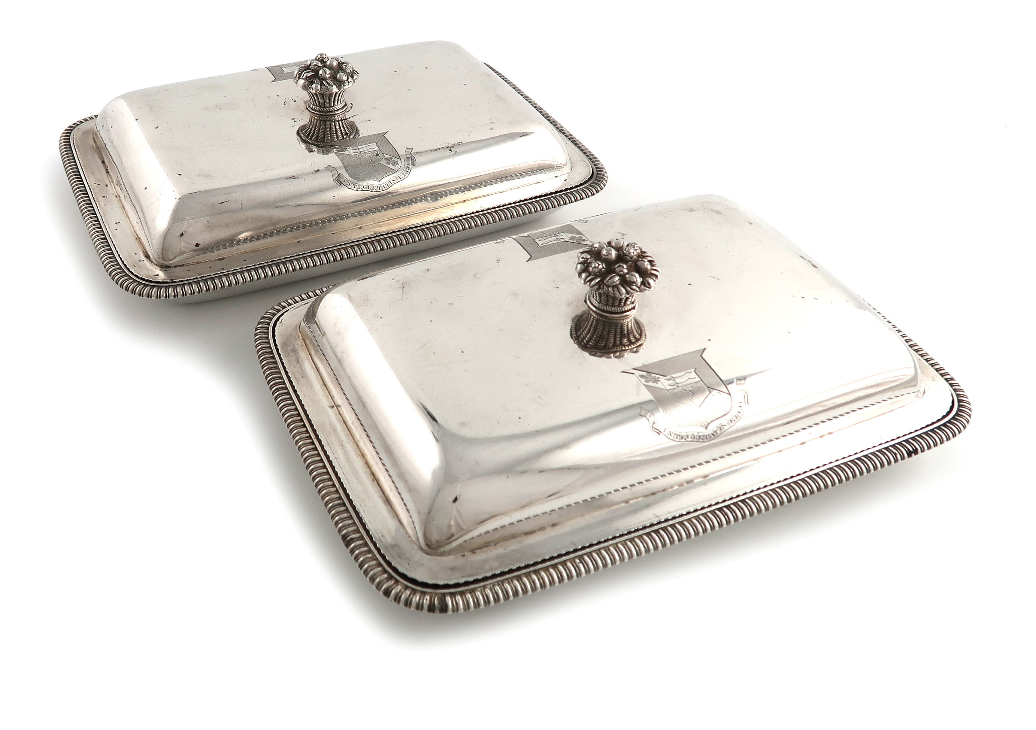 rectangular form, gadrooned borders, with engraved armorials to the covers and crests to the dishes, screw-off finals modelled as baskets of fruits, one cover London 1803, one numbered '2', the other numbered '1' and '3', length 28.4cm, approx. weight 99.7oz. (4)
