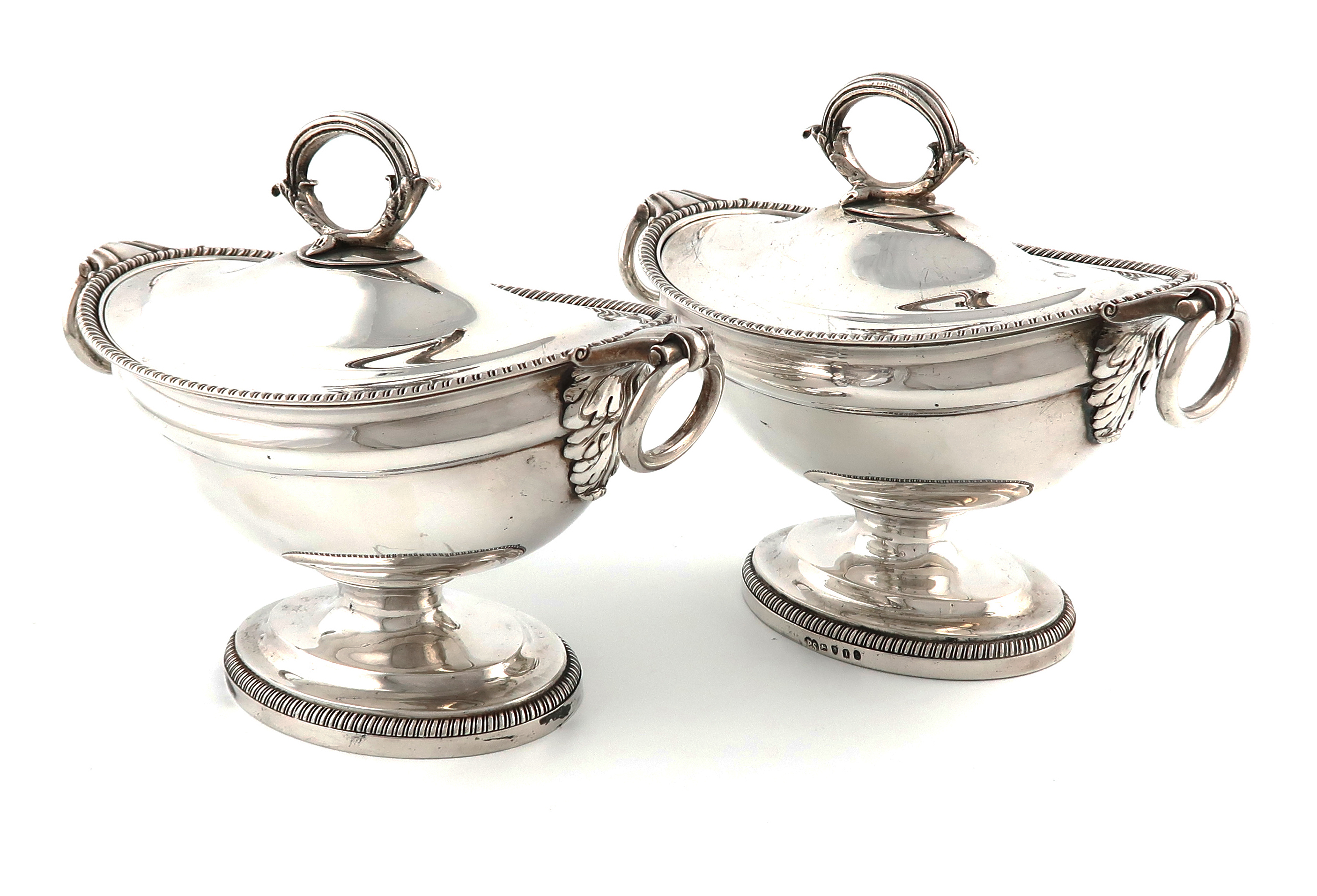 plain oval form, with two drop-ring handles with acanthus leaf decoration, gadrooned borders, domed pull-off cover with reeded and foliate ring handle, (unmarked), on a raised oval base, numbered '1' and '3', length handle to handle 20.6cm, approx. weight 45oz. (2)