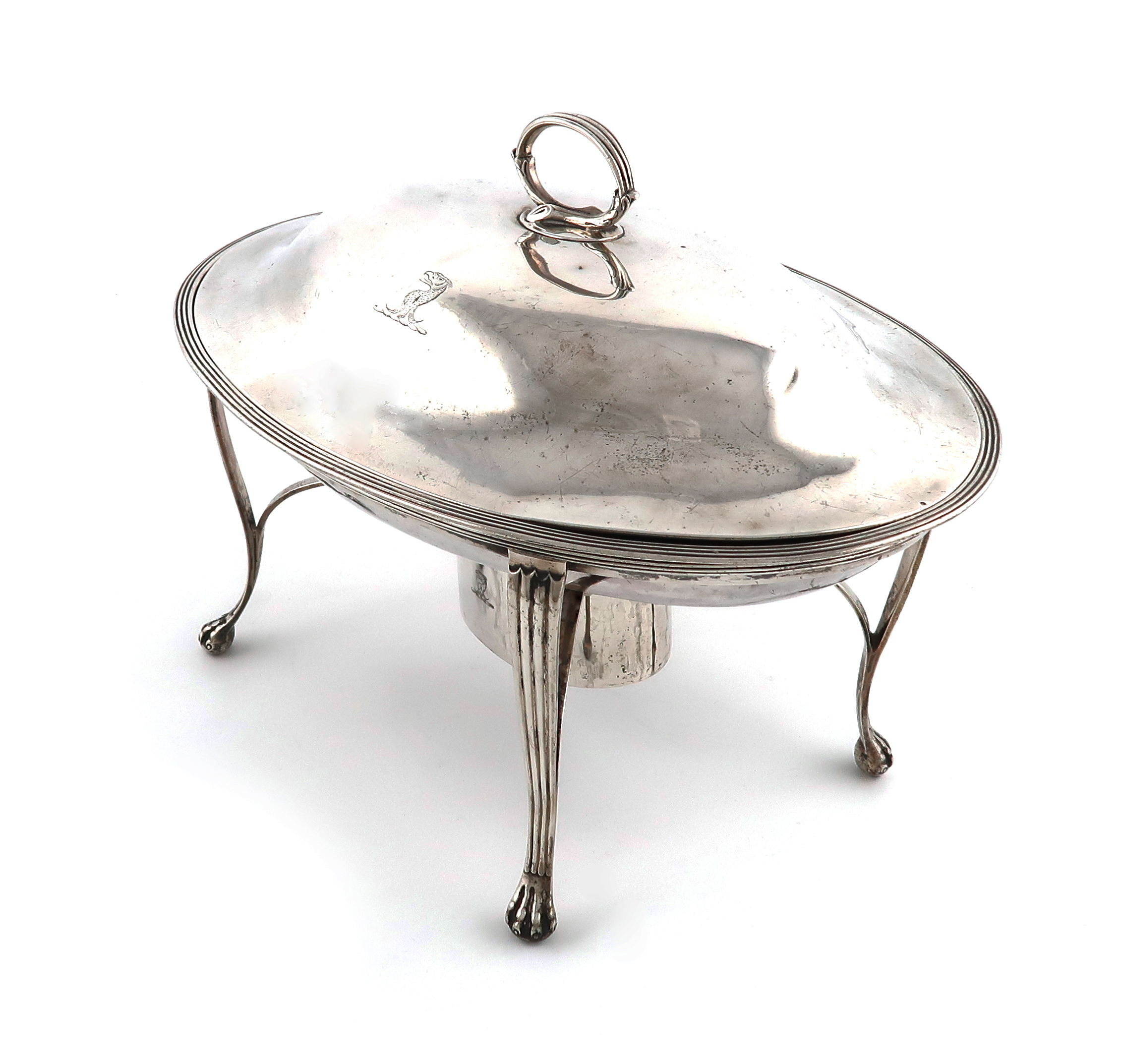 oval wire-work form, threaded borders and supports, on four claw and ball feet, the dish cover of plain oval form, with a ring handle, engraved with a crest and with a ring handle, the dish of plain oval form with a reeded border and engraved crest, length 30.9cm, approx. weight 49.4oz. (4)