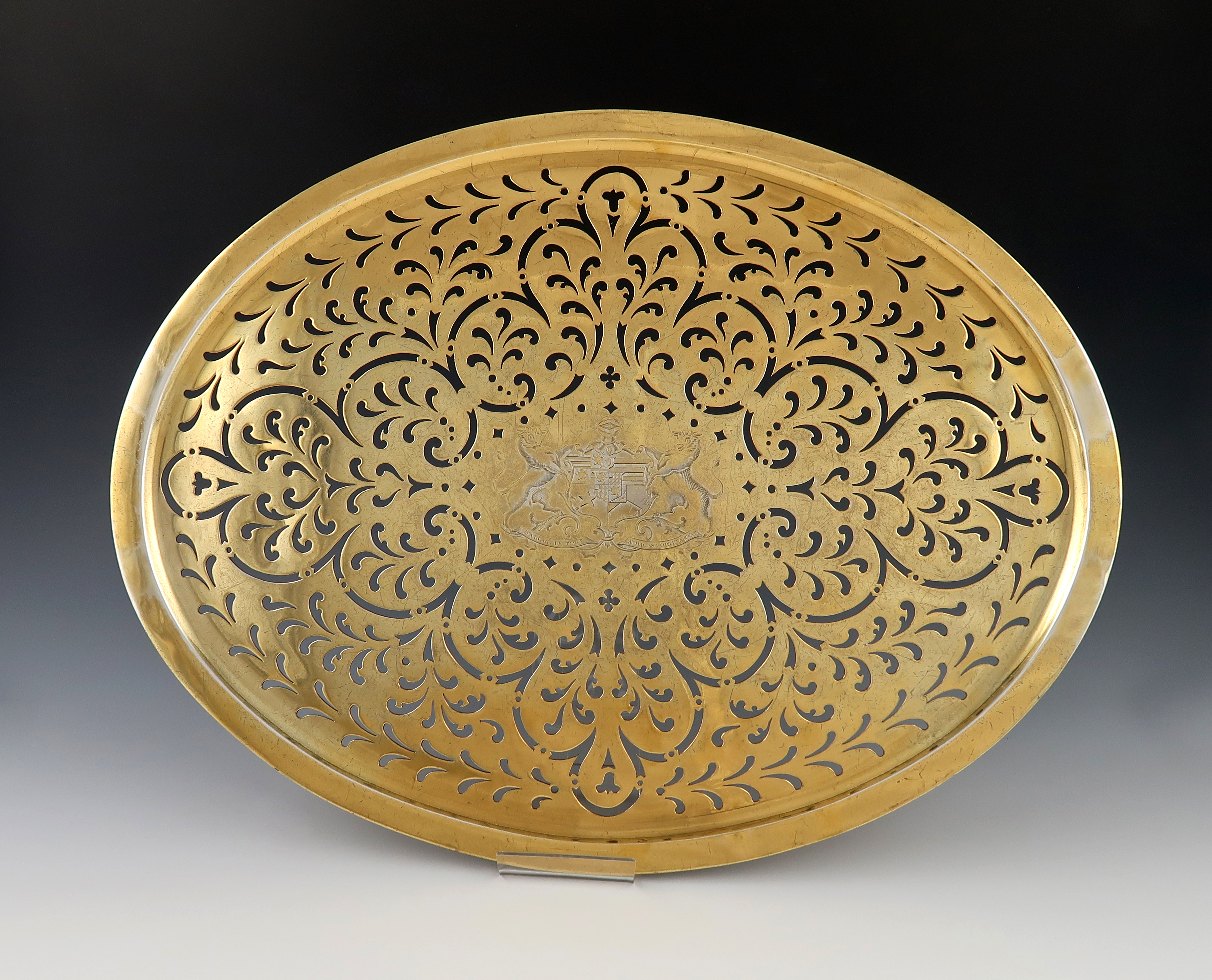 oval form, pierced with foliate and scroll decoration, the centre with an engraved armorial, length 49.7cm, approx. weight 43.6oz.