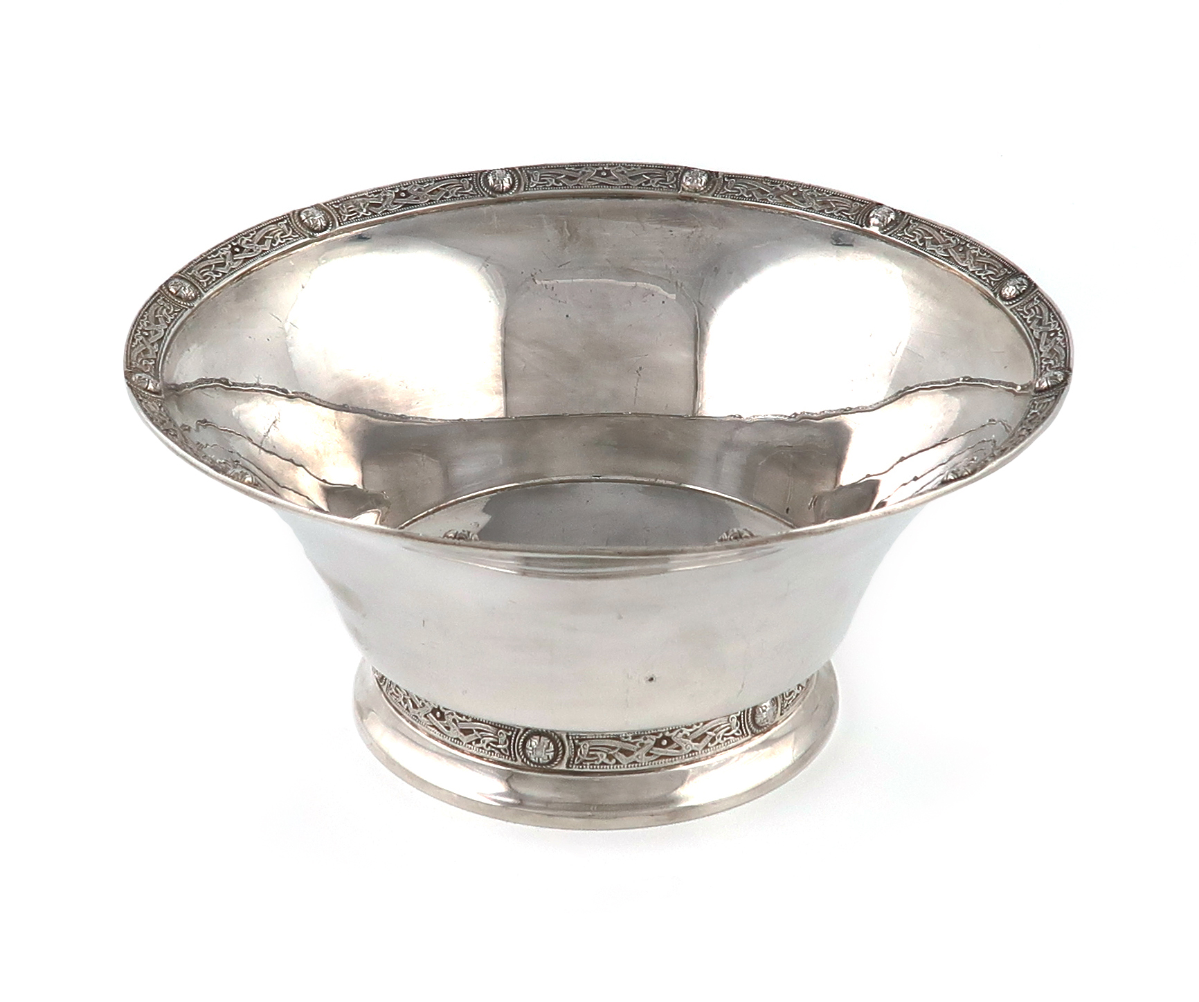 circular form, border chased with Celtic strap-work and bosses, on a raised circular foot with similar border, diameter 20.2cm, approx. weight 13.6oz.