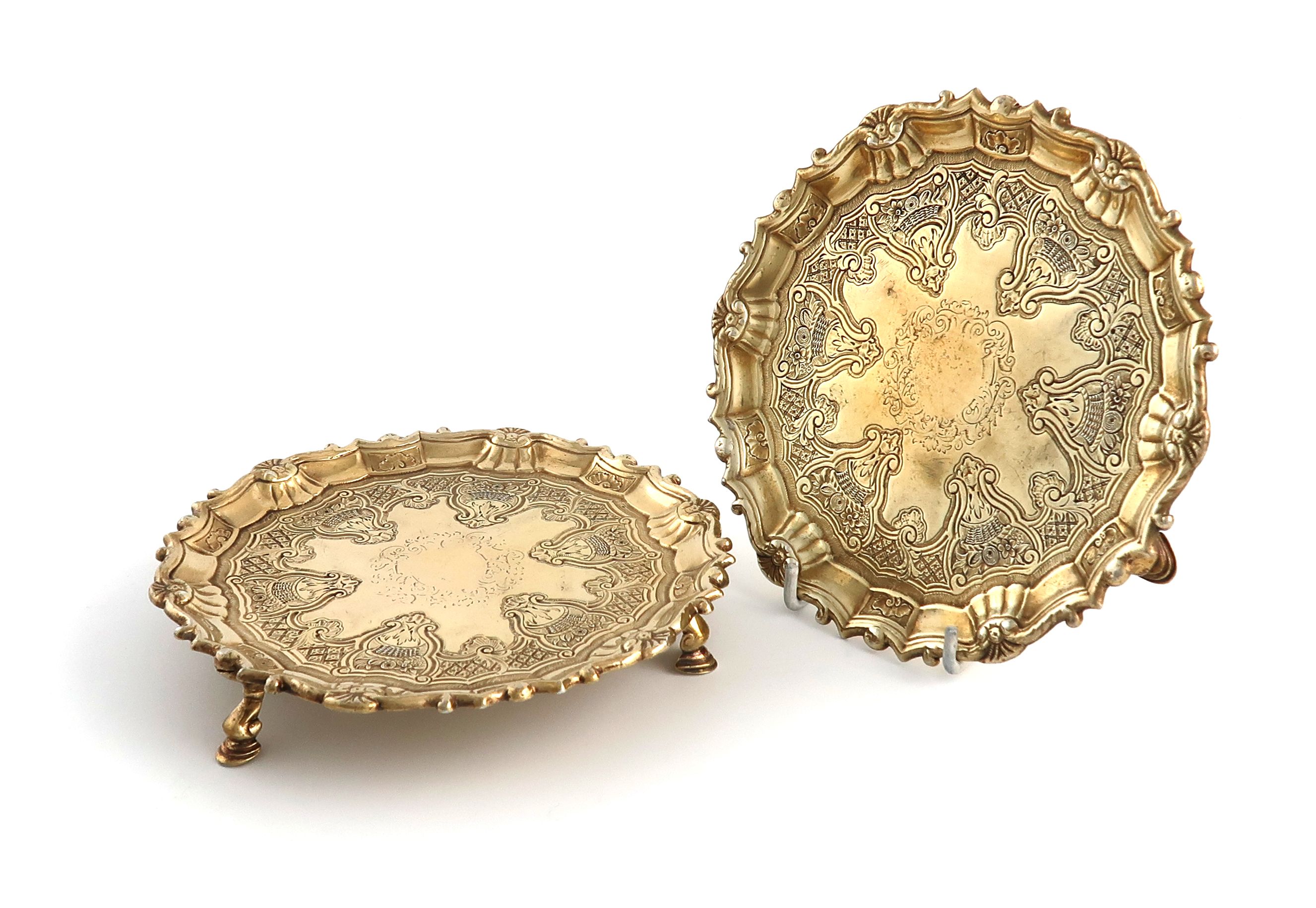 circular form, scroll and shell border, the centre engraved with scrolls, diaperwork and flowers around a worn vacant cartouche, the undersides with scratch weights '10:1:½' and '9:14', on three hoof feet, diameter 16.3cm, total approx. weight 18.5oz. (2)