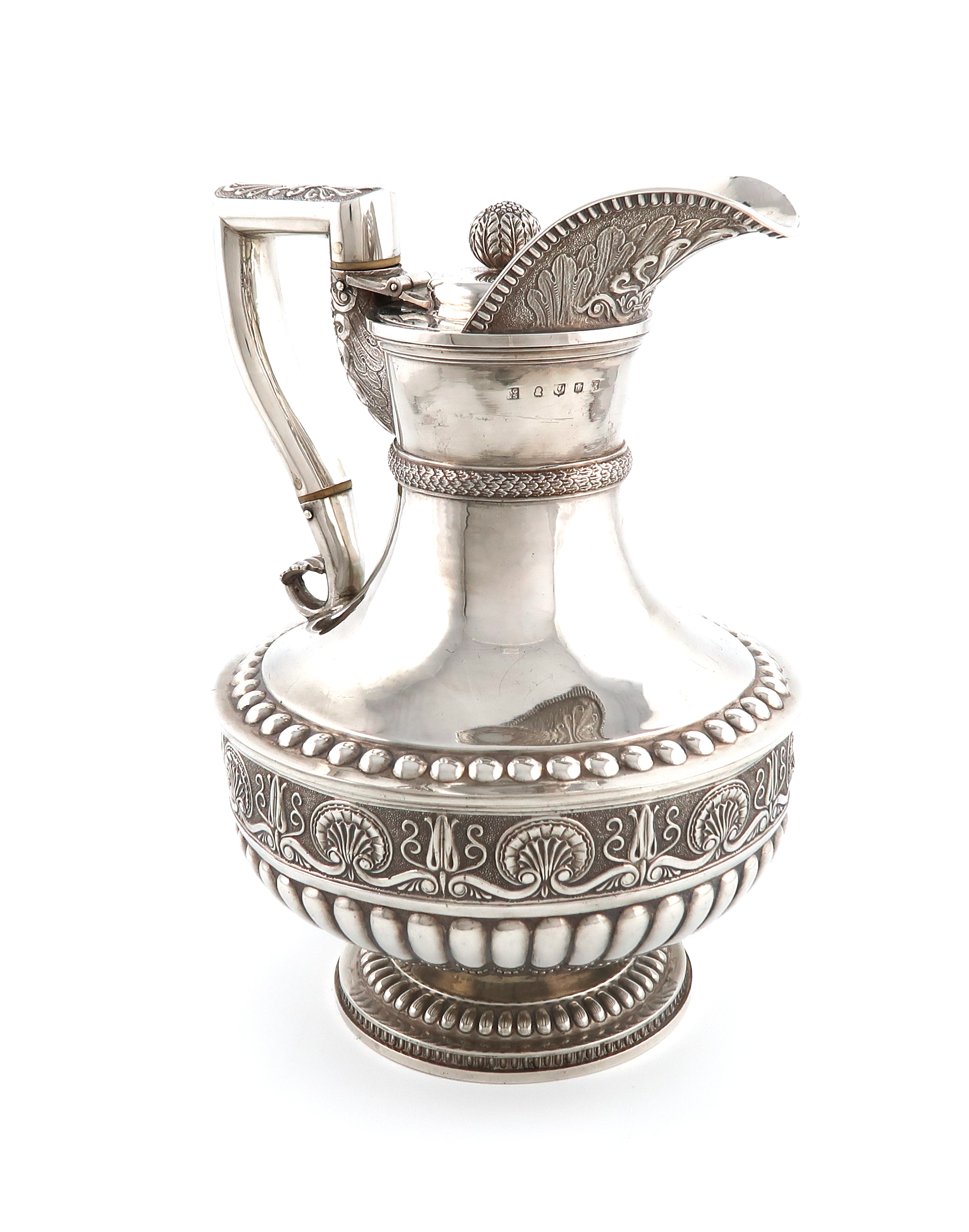 baluster form, part-fluted, shell and scroll border with large beading above, laurel leaf girdle to the neck, angular scroll handle with anthemion thumbpiece and shoulder and a shell terminal, ivory insulators, anthemion-capped spout with gadroon border, the hinged stepped cover with a bud finial, on a raised circular foot with gadroon border, height 24.2oz, approx. weight 33oz.