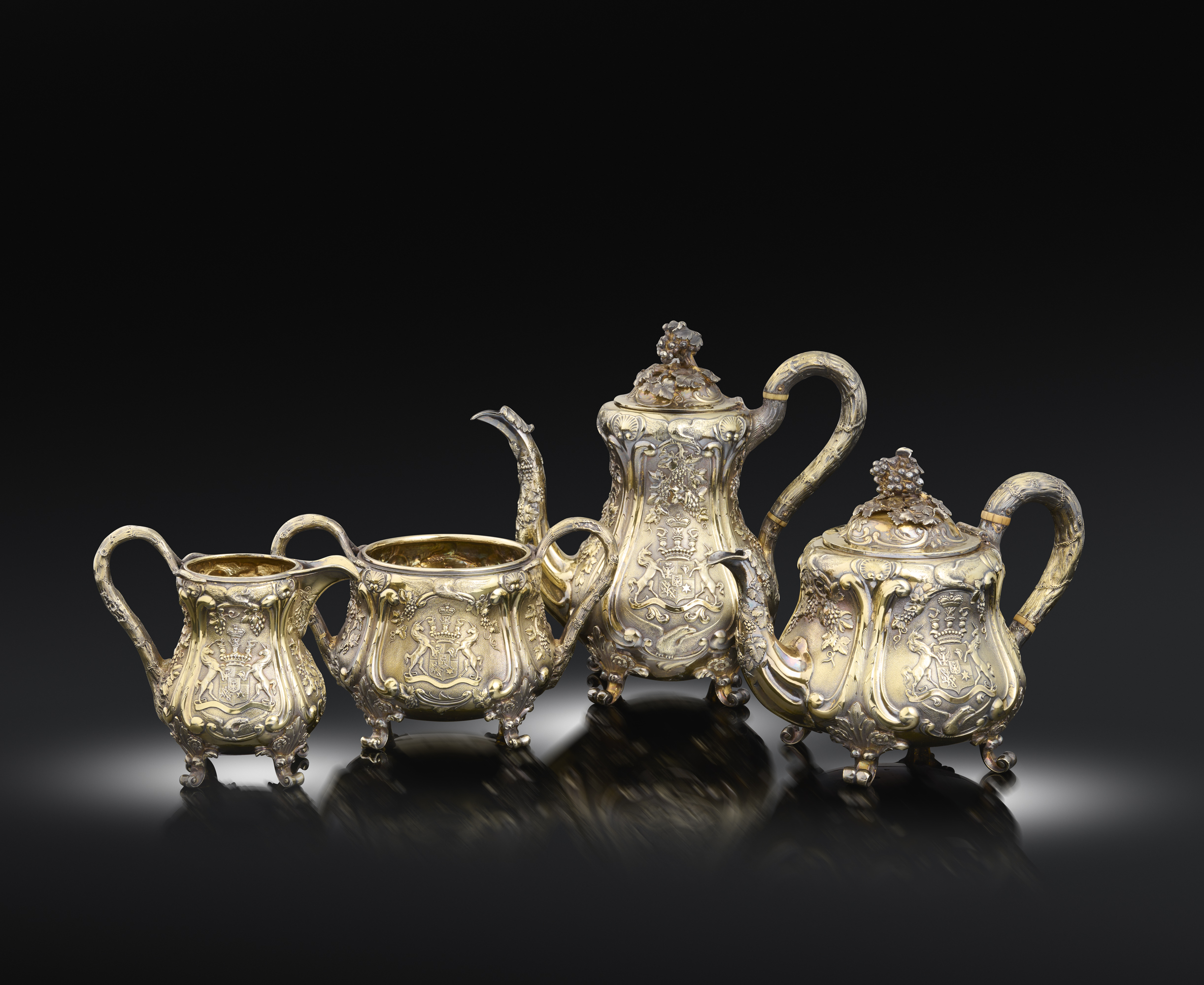 λA Victorian silver-gilt four-piece tea and coffee set,