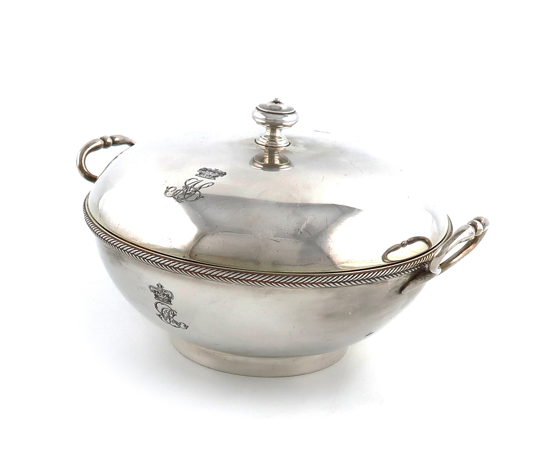 circular form, rope border, engraved with the Coronet for a Princess of the Blood Royal over 'AS' and the Royal Crown over 'RC', scroll handles, to underside scratch lettering 'EA.' over 'Fs.', on a collet foot, the domed pull-off cover with knop finial, engraved with matching cyphers, diameter 14.8cm, total approx. weight 15.5oz.