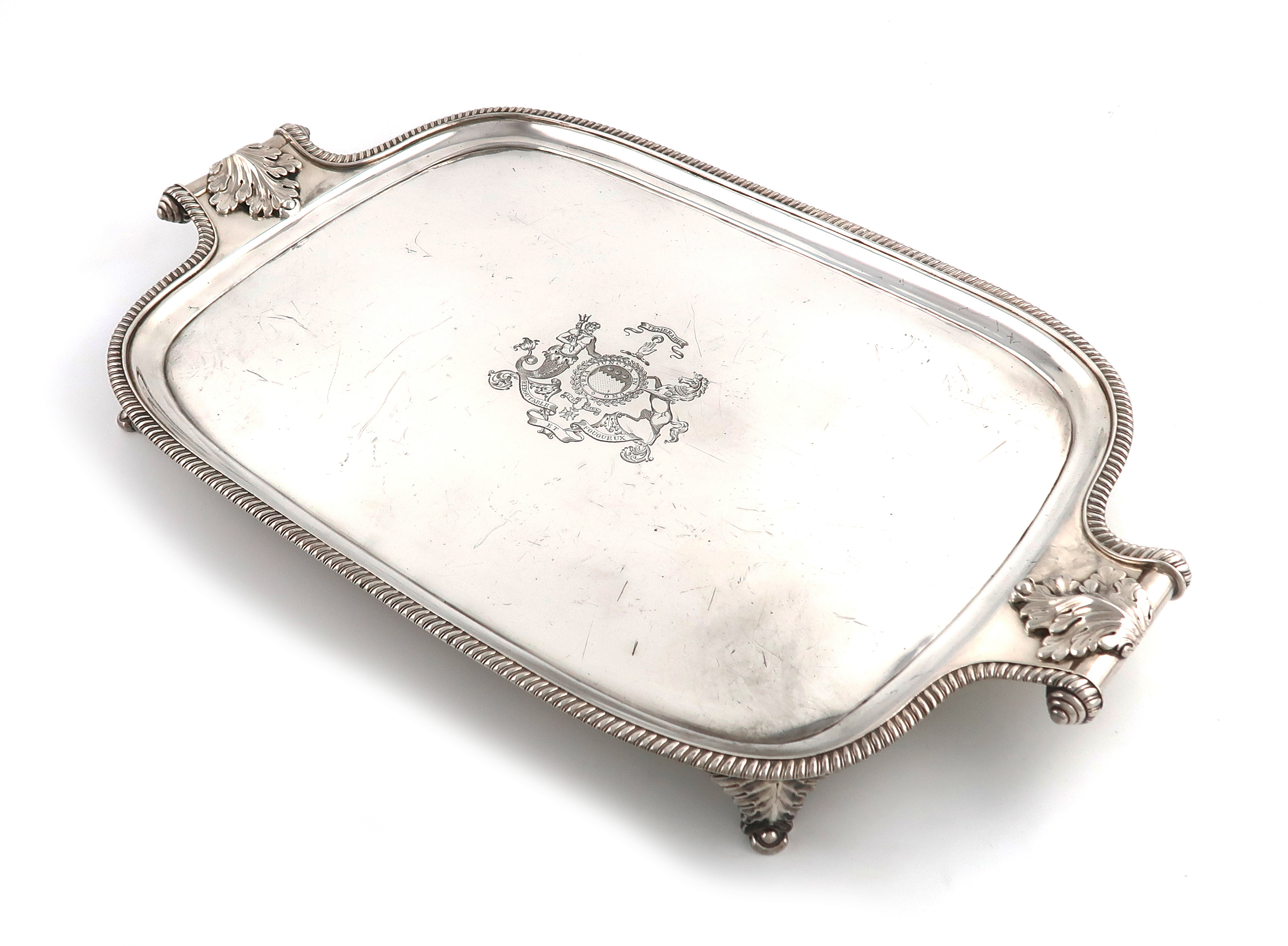 rounded rectangular form, gadroon border, the centre engraved with an armorial, acanthus leaf handles, on four acanthus leaf bracket feet, length handle to handle 56cm, approx. weight 88oz.