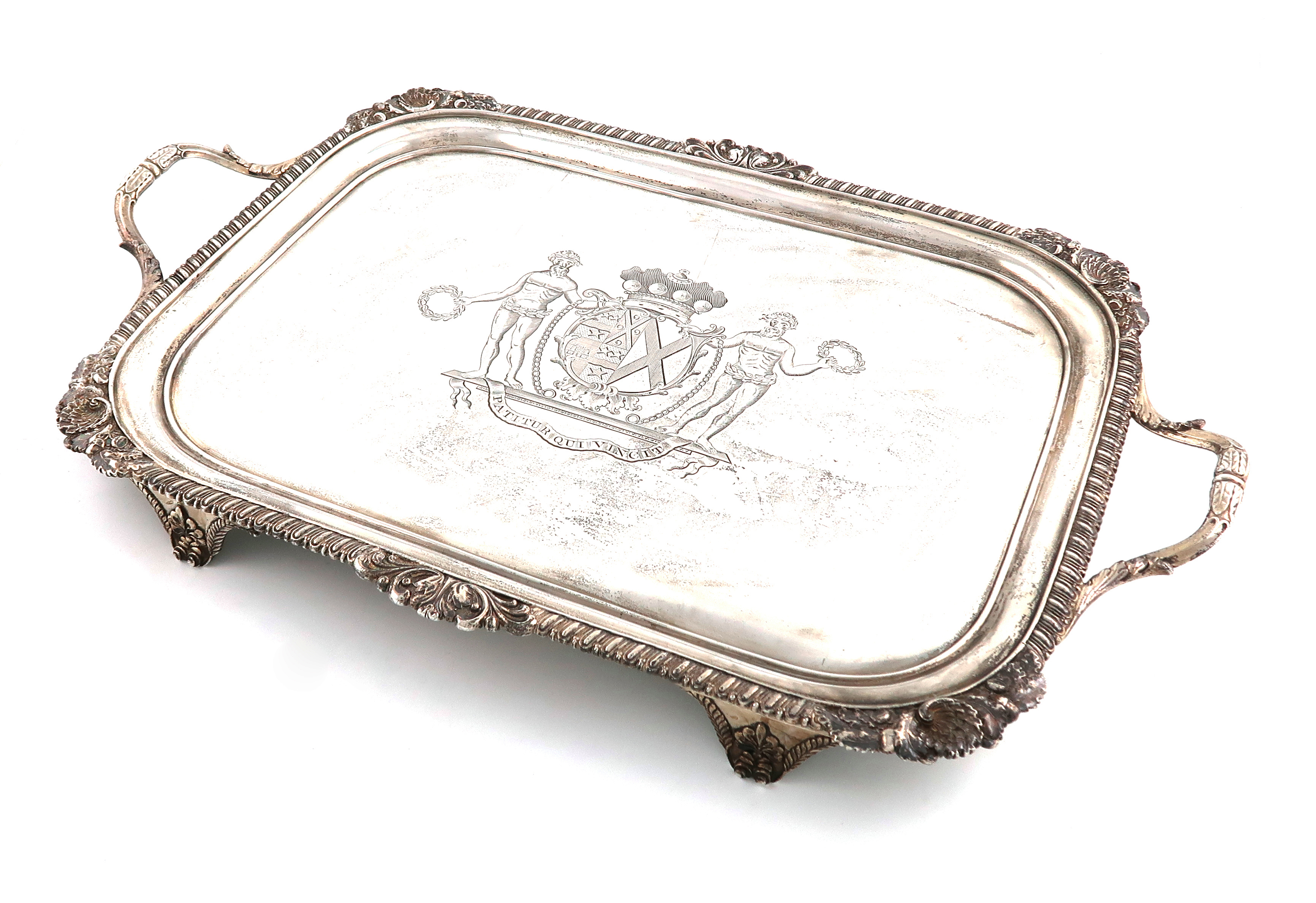 rounded rectangular form, gadroon, foliate shell and oak leaf border, the centre engraved with an armorial, foliate scroll handles, on four honeysuckle bracket feet, length handle to handle 67.7cm, approx. weight 158oz.