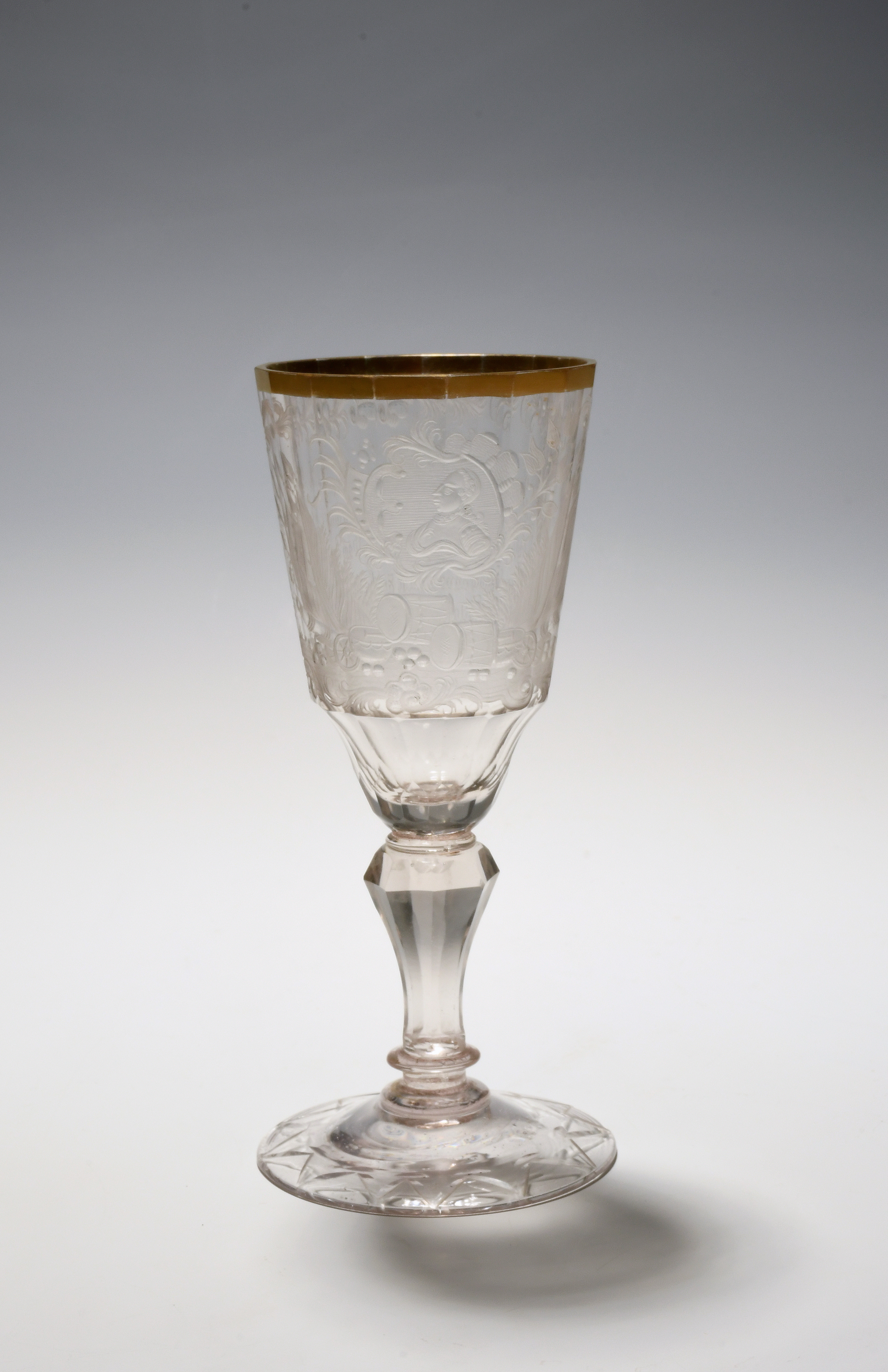 A Prussian engraved wine glass, c.1740, the faceted bowl engraved with a portrait of a Hohenzollern king, probably Frederick Wilhelm I, on a shield above military motifs, the reverse with an inscription in German referring to the Prussian army of 80,000 men, raised on a faceted stem and cut foot, 17.2cm.