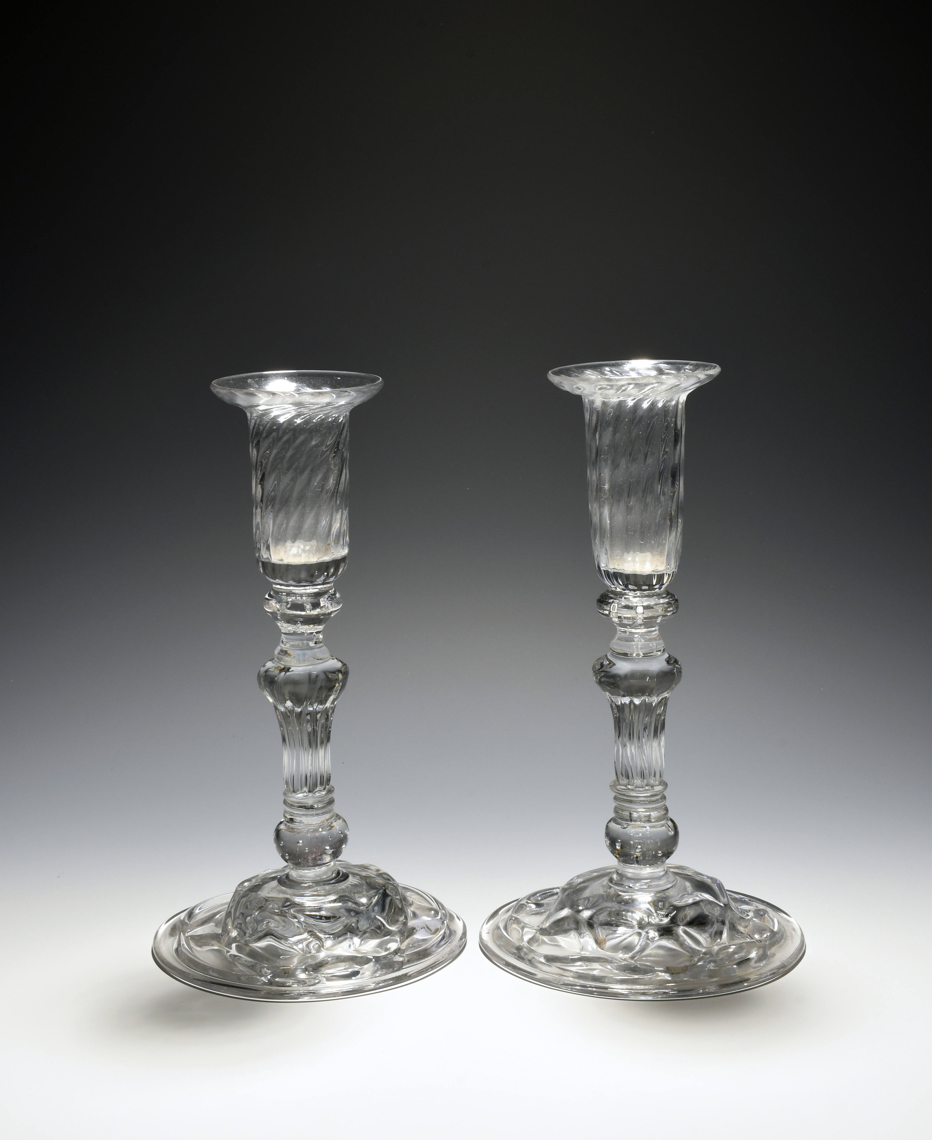 A rare pair of composite glass candlesticks, c.1760, English or Norwegian, the deep moulded sconces raised on beaded knops over moulded baluster stems set into triple mereses over basal beaded knops, the helmet folded feet with honeycomb moulding, 22.3cm. (2)