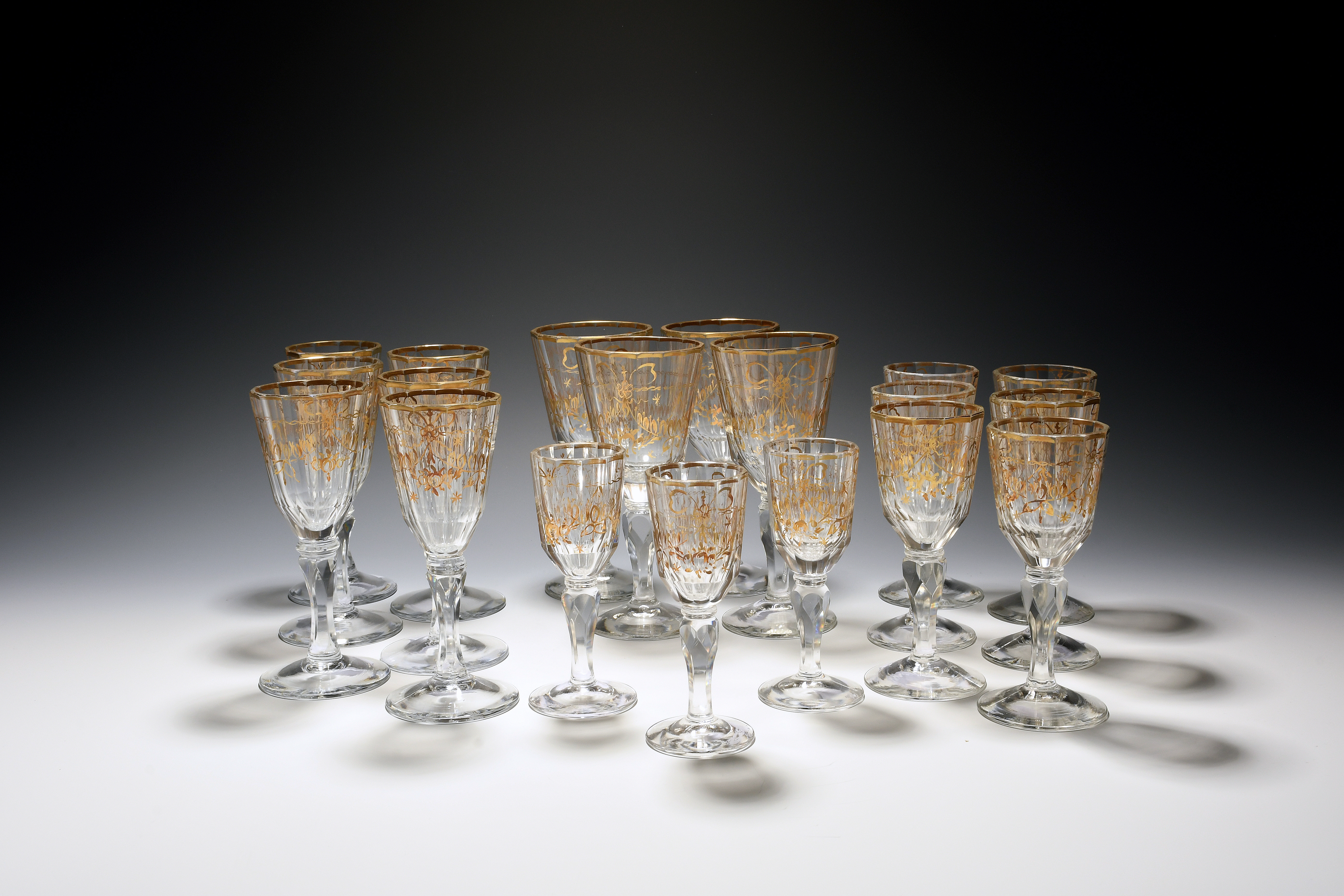 A part suite of Continental glass, 19th/early 20th century, the faceted bowls gilded with flower garlands issuing from tied ribbons above a chainlink border, raised on facet cut stems. Comprising: four red wine glasses, six white wine glasses, six port glasses and three liqueur glasses. (19)