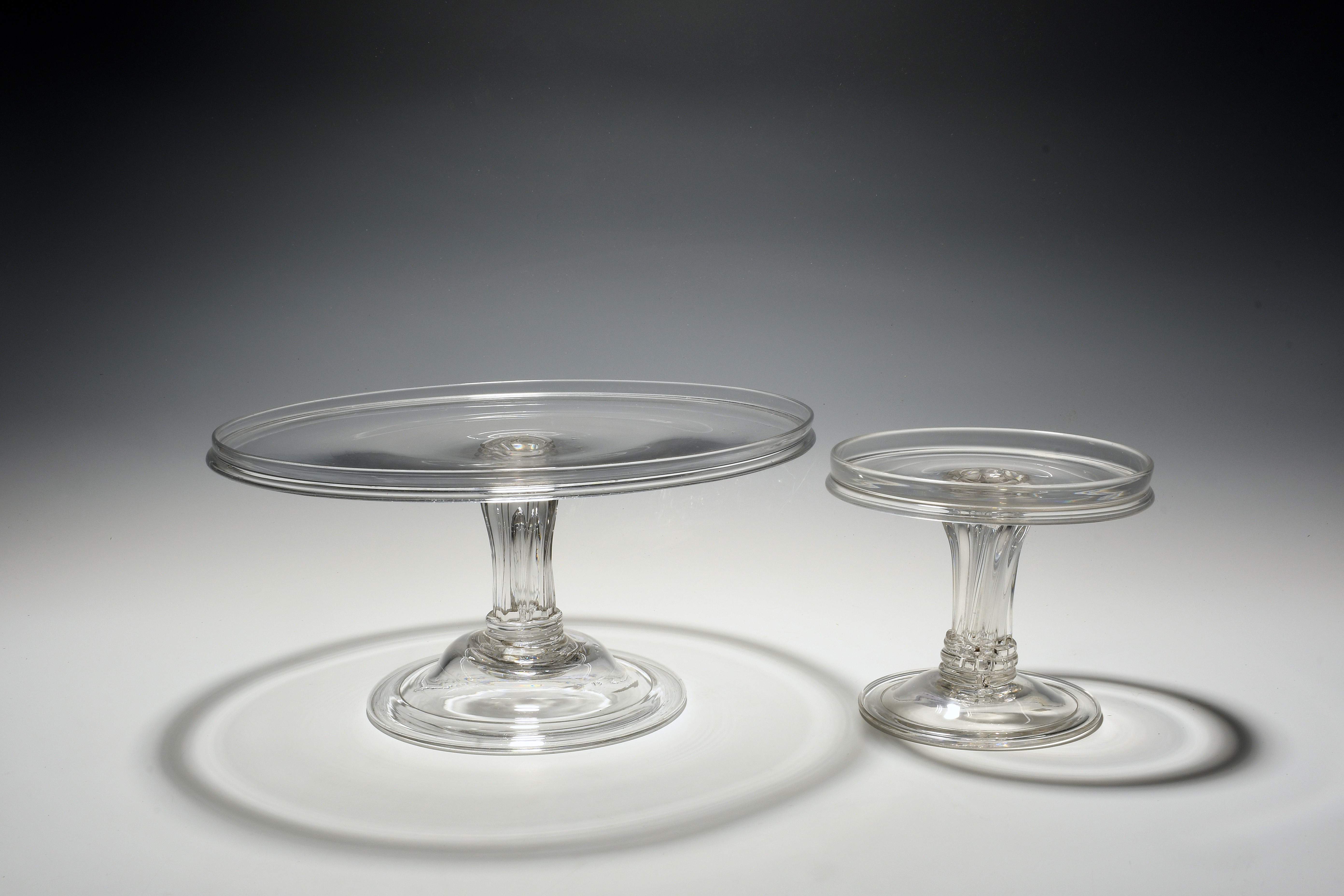 Two glass tazzae, mid 18th century, each flat top raised over a moulded stem rising from collar rings, over domed folded feet, 31cm dia. max. (2)