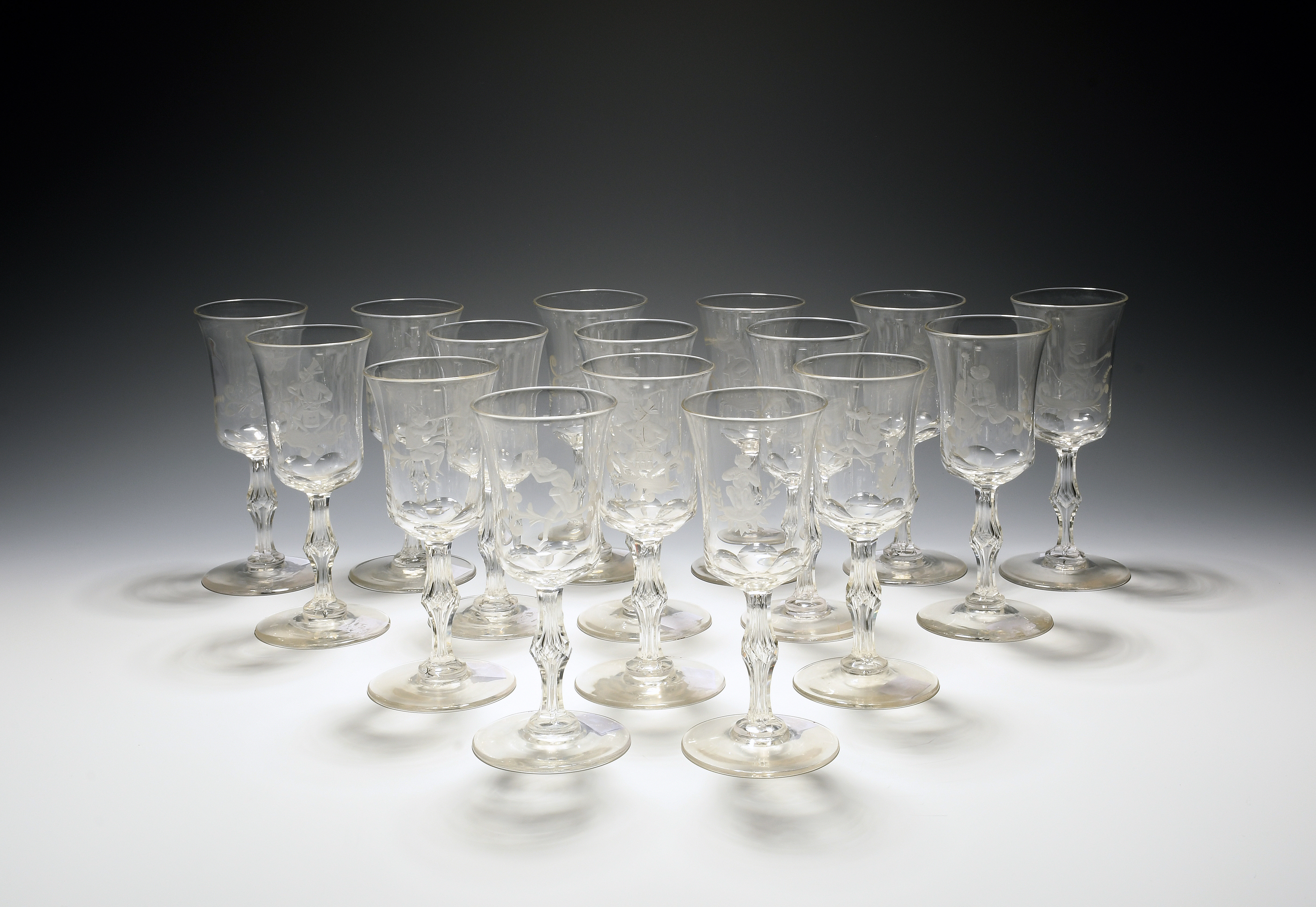 A part suite of sixteen wine glasses, 20th century, the tall bowls engraved with various figures from a monkey band, seated or standing on scroll motifs, raised on swollen faceted stems, 14.8cm. (16)