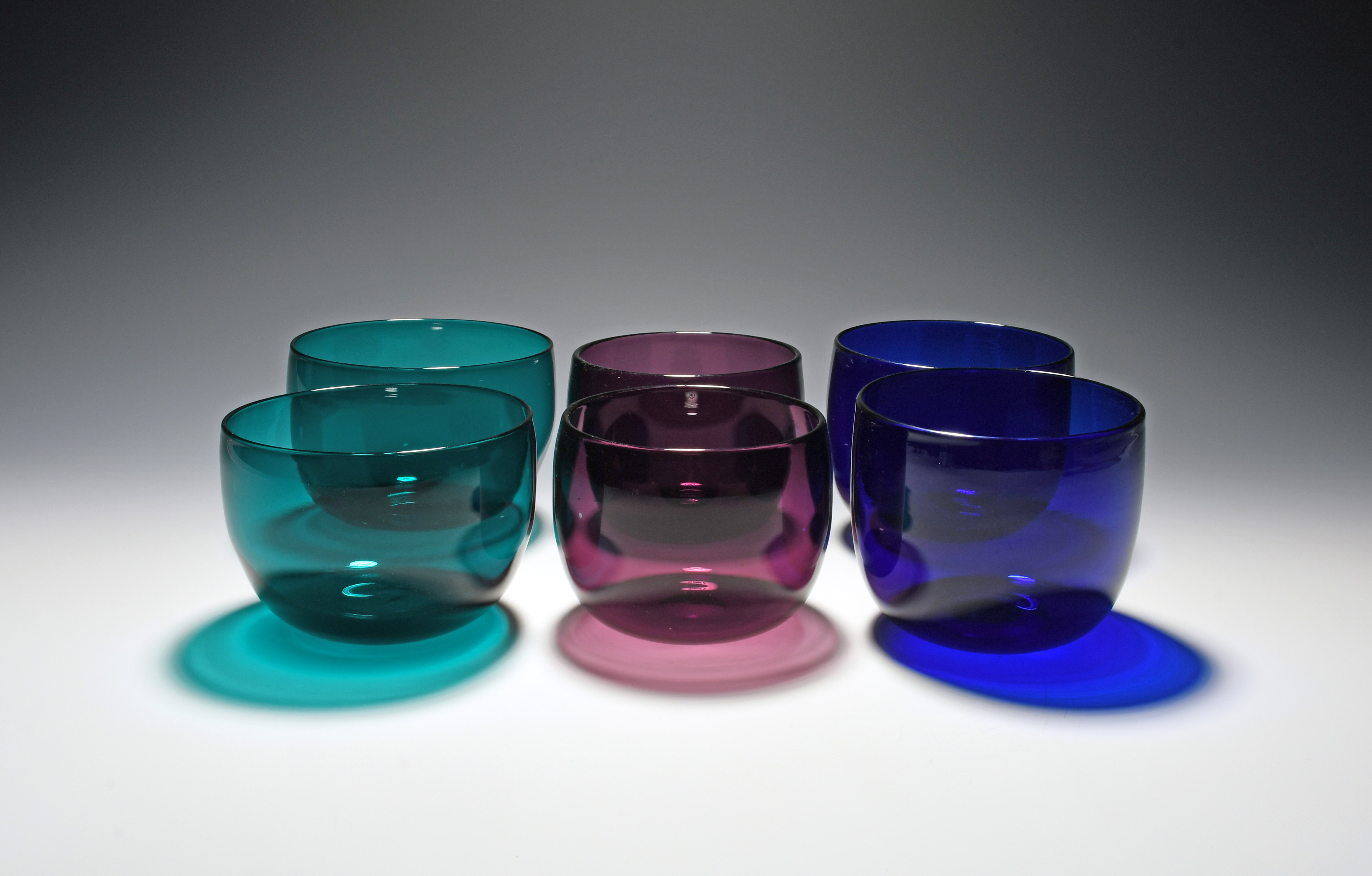 Three pairs of coloured glass finger bowls, c.1800, of rounded U-shape, in cobalt blue, emerald green and amethyst, 10cm max. (6)