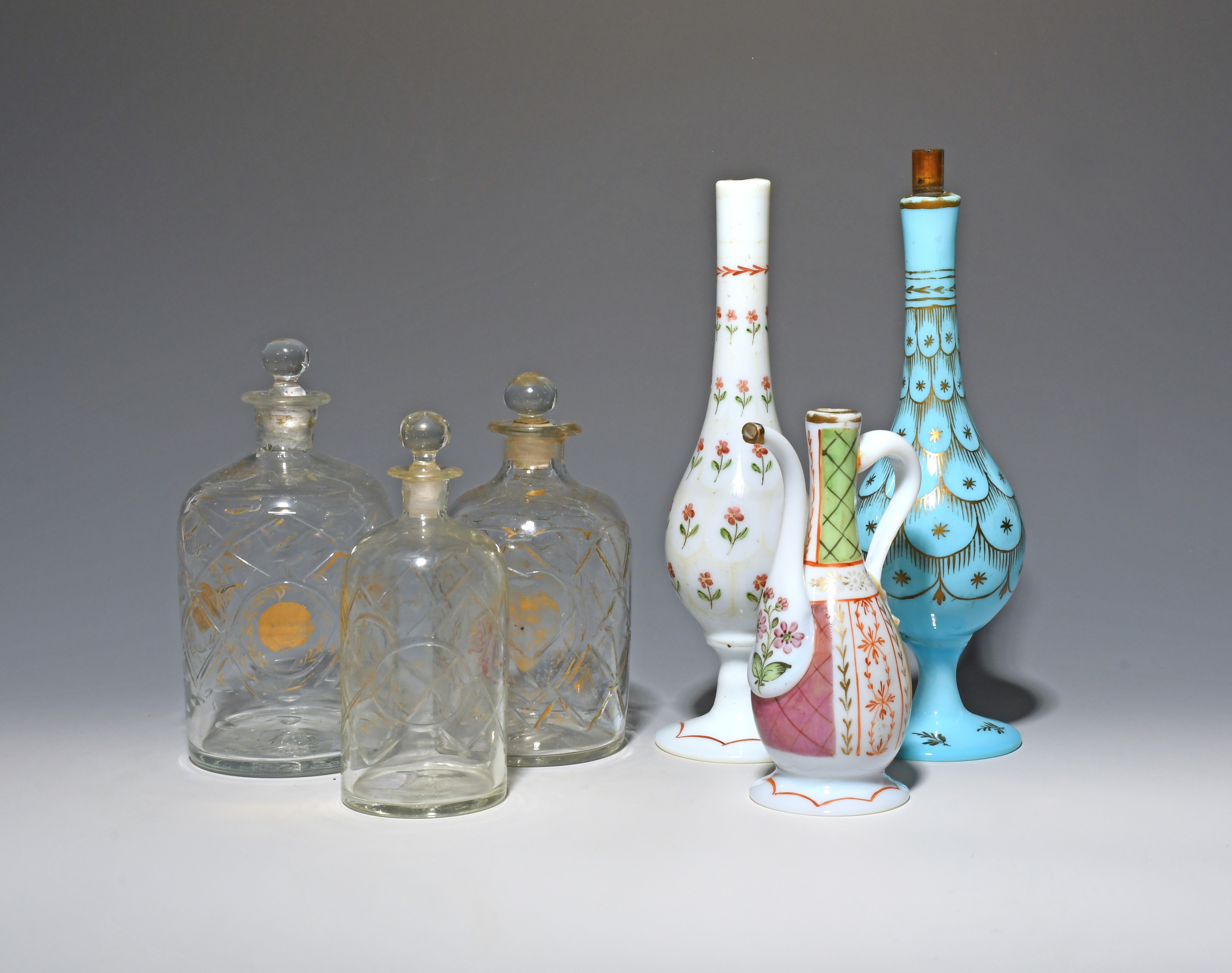 Six glass bottles for the Middle Eastern market, 19th century, three cut with trellis designs and gilt foliate motifs, one of blue opaque glass with a gilt scale design, another white opaque glass with a panelled floral design, the last a ewer with thin curved spout, four with stoppers, 26.5cm max. (10)