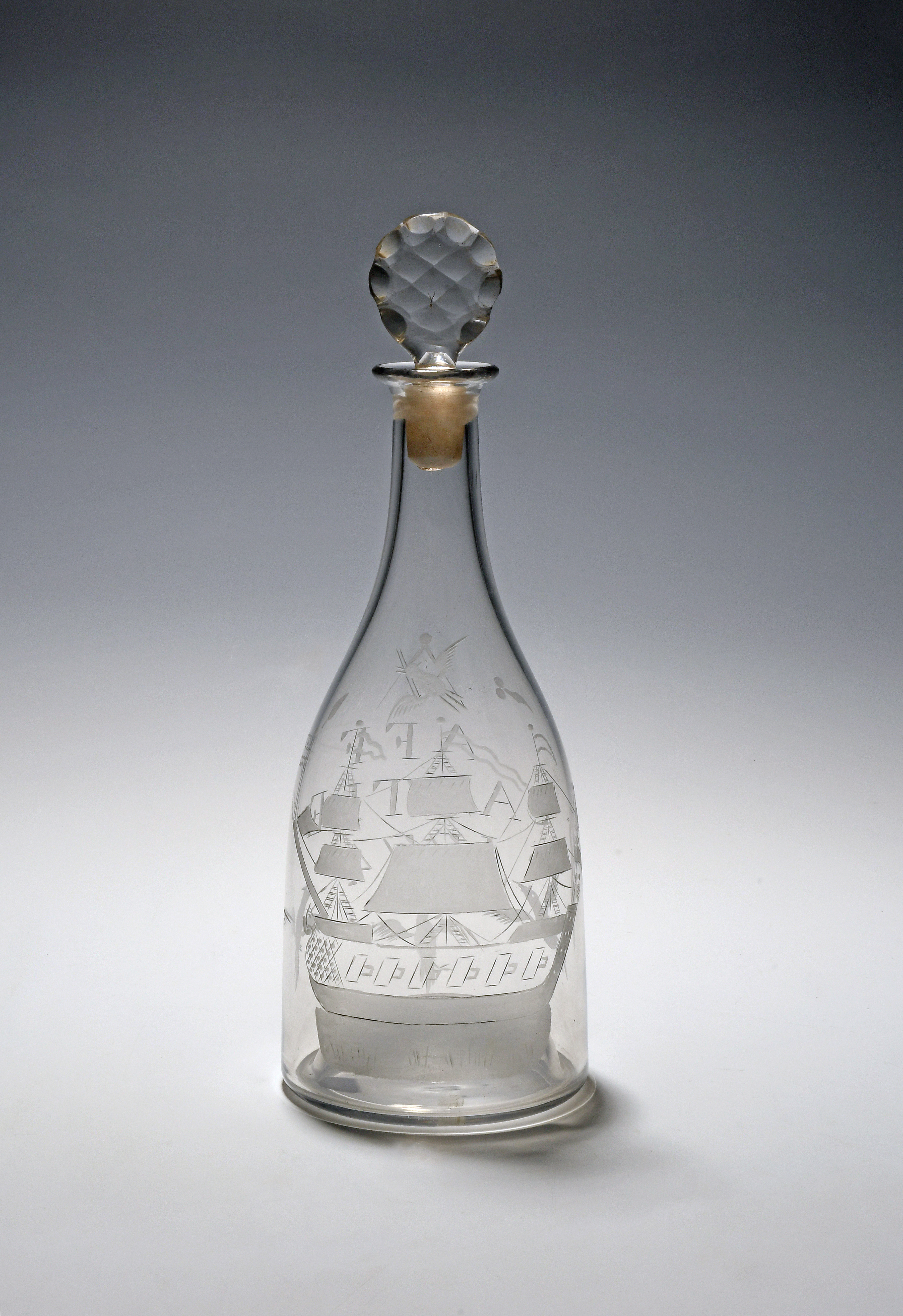 A glass decanter and stopper, dated 1774, of club shape and engraved with a three-masted ship at sail, the reverse inscribed 'A F F / CASTLE / 1774' between Masonic emblems, with a flattened honeycomb stopper, 27.7cm. (2)