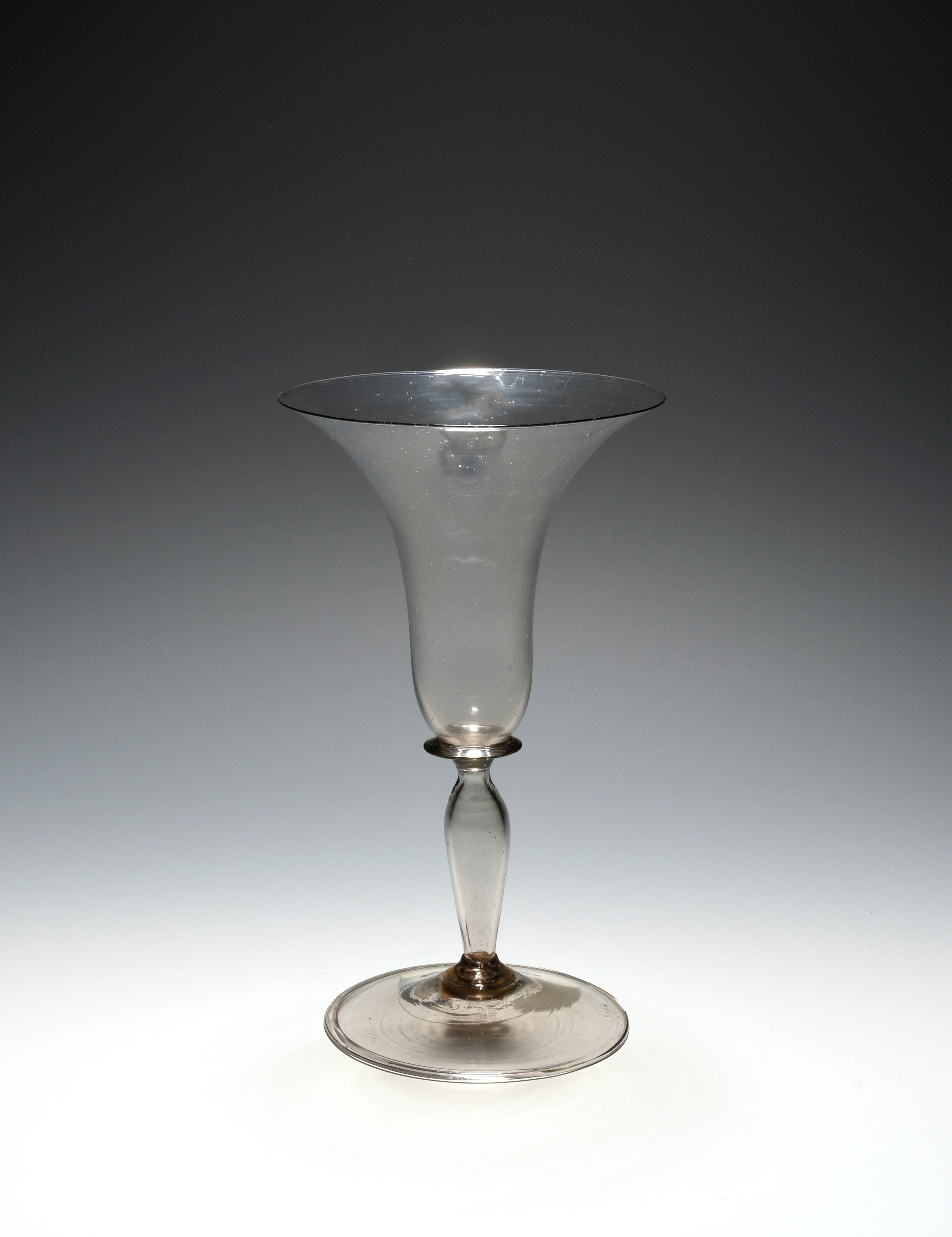 A Venetian or façon de Venise wine glass or goblet, 17th century, with a large bell bowl over a collar knop above a hollow stem and folded foot, 17.1cm.