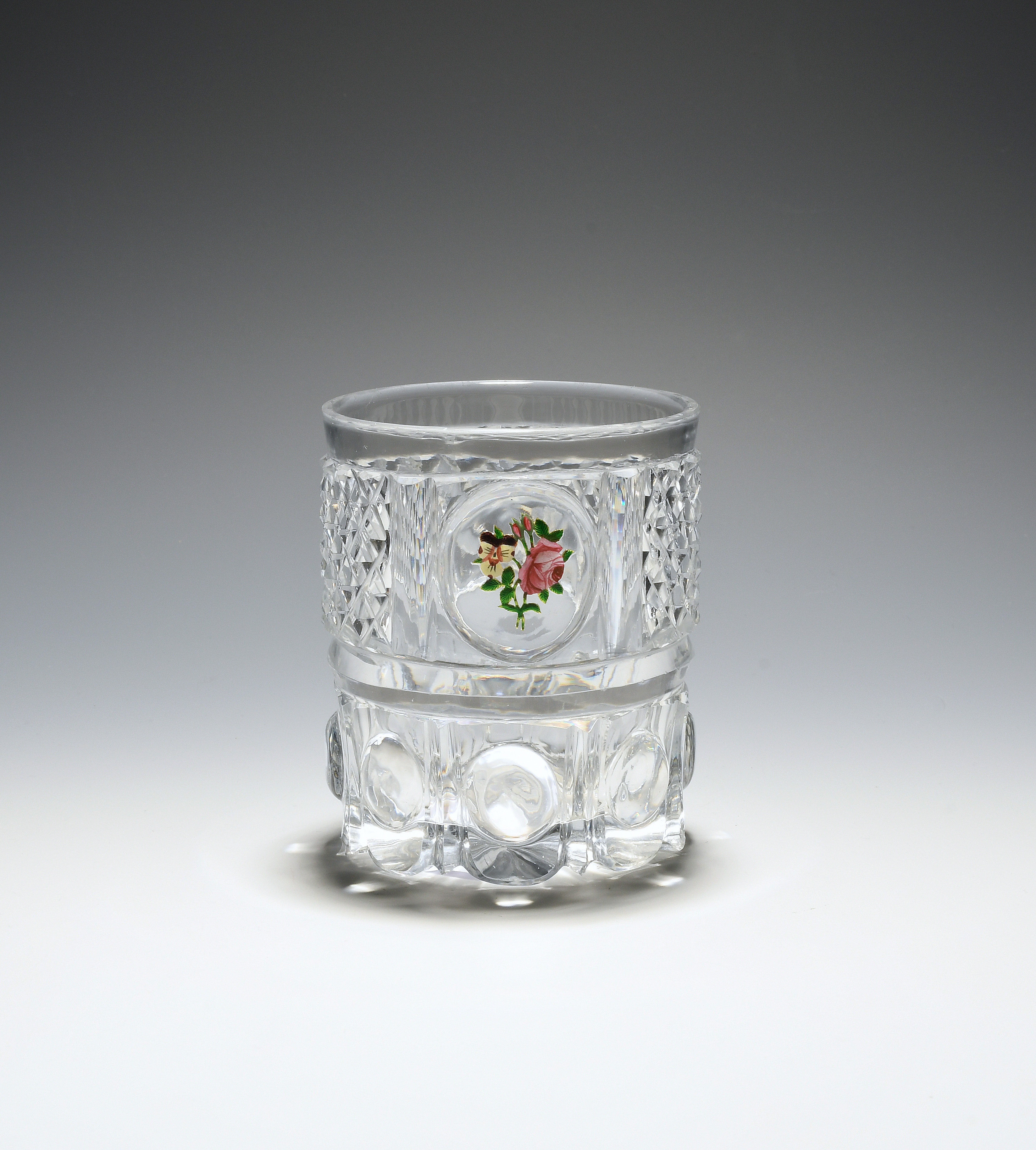 A Baccarat cut glass tumbler, 19th century, enamelled and foiled with a spray of rose and heartsease on a panel within a wide hobnail cut border, 9.2cm.