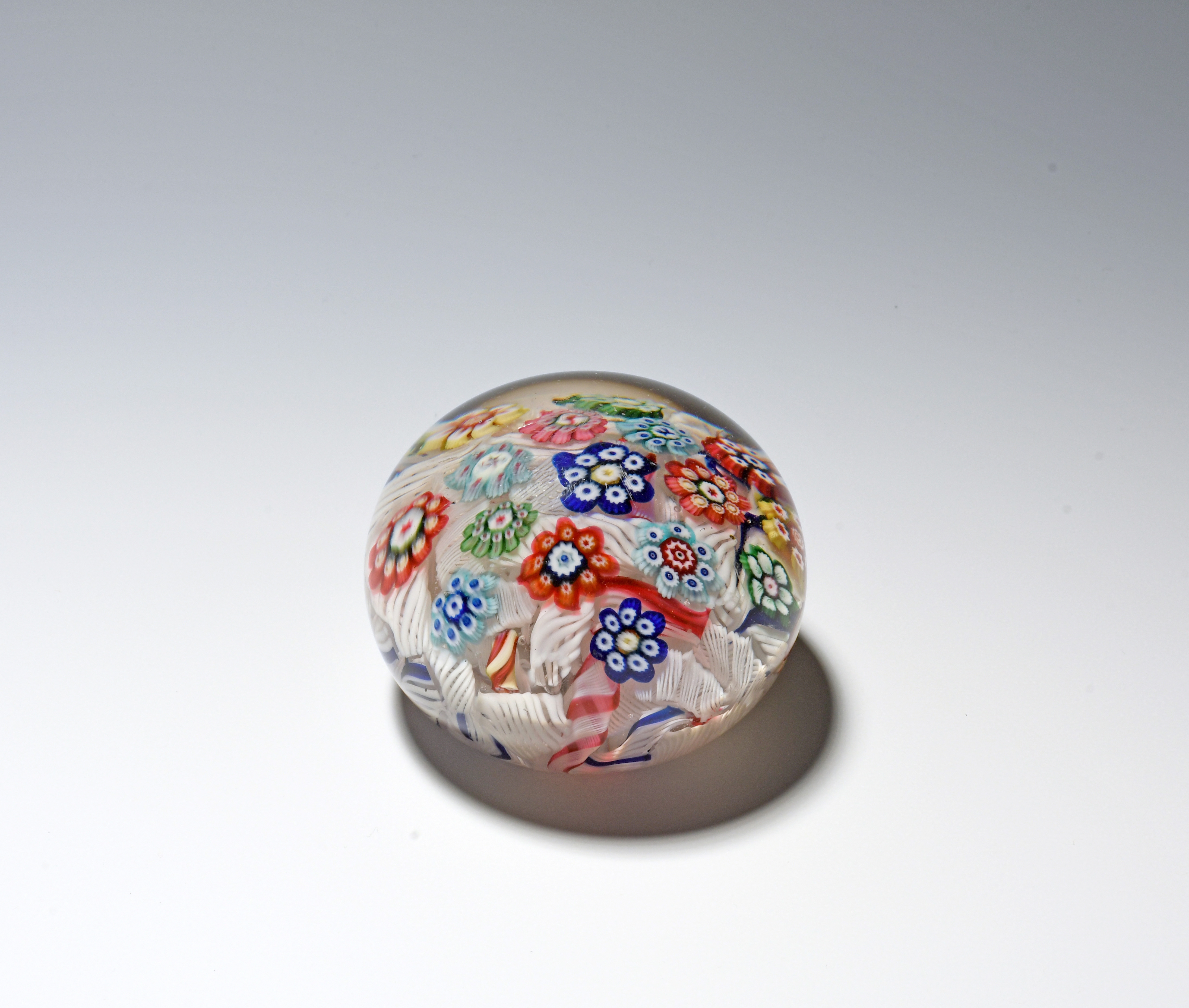 A Baccarat spaced millefiori paperweight, mid 19th century, set with sixteen stylized flower canes including animal silhouettes, set on a ground of latticino canes in white, red and blue, 6.2cm dia.